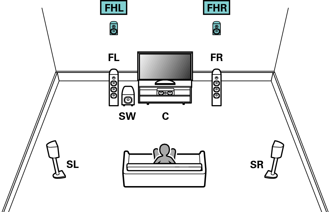 Questo sistema surround a 7.1 canali è identico a un impianto di base a 5.1 canali, ma con diffusori superiori anteriori.