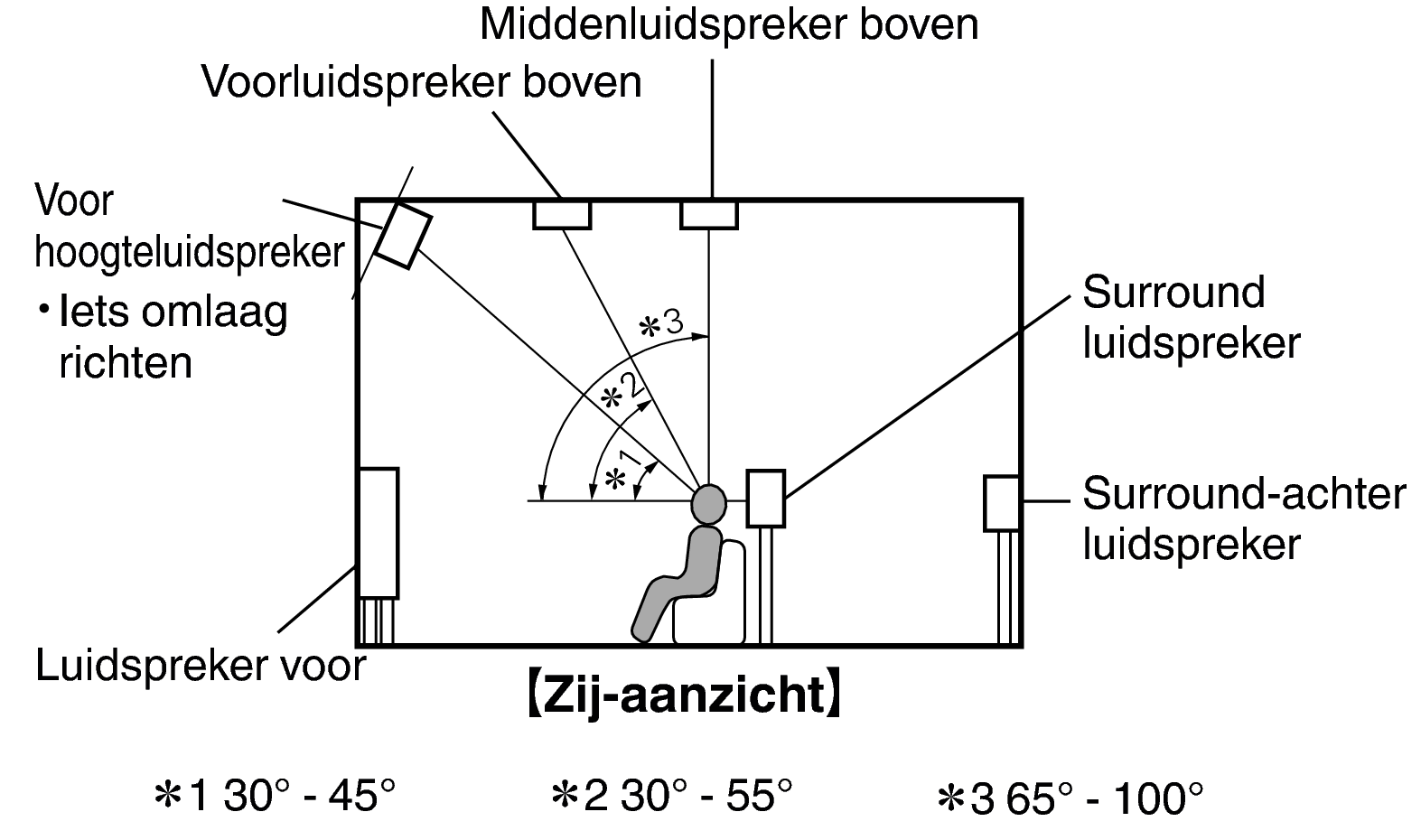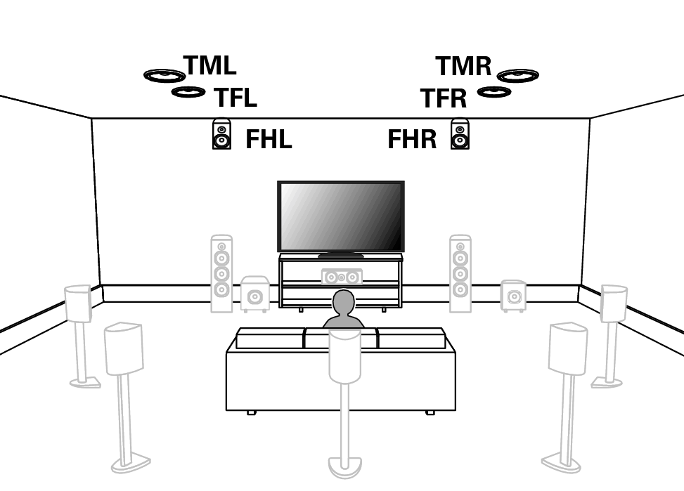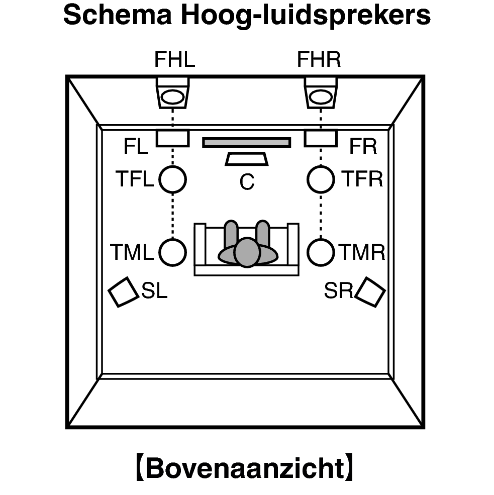 Plaats de linker- en rechterluidsprekers FRONT HEIGHT direct boven de voorluidsprekers. Monteer ze zo dicht mogelijk bij het plafond en richt ze naar de hoofdluisterpositie. |