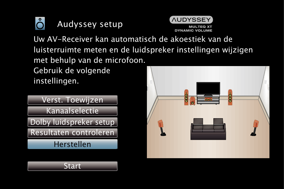 Als u “Herstellen” instelt op “Herstellen”, kunt u terugkeren naar het meetresultaat van de Audyssey® setup (waarde berekend bij de start via MultEQ® XT), zelfs als u elke instelling handmatig hebt gewijzigd.