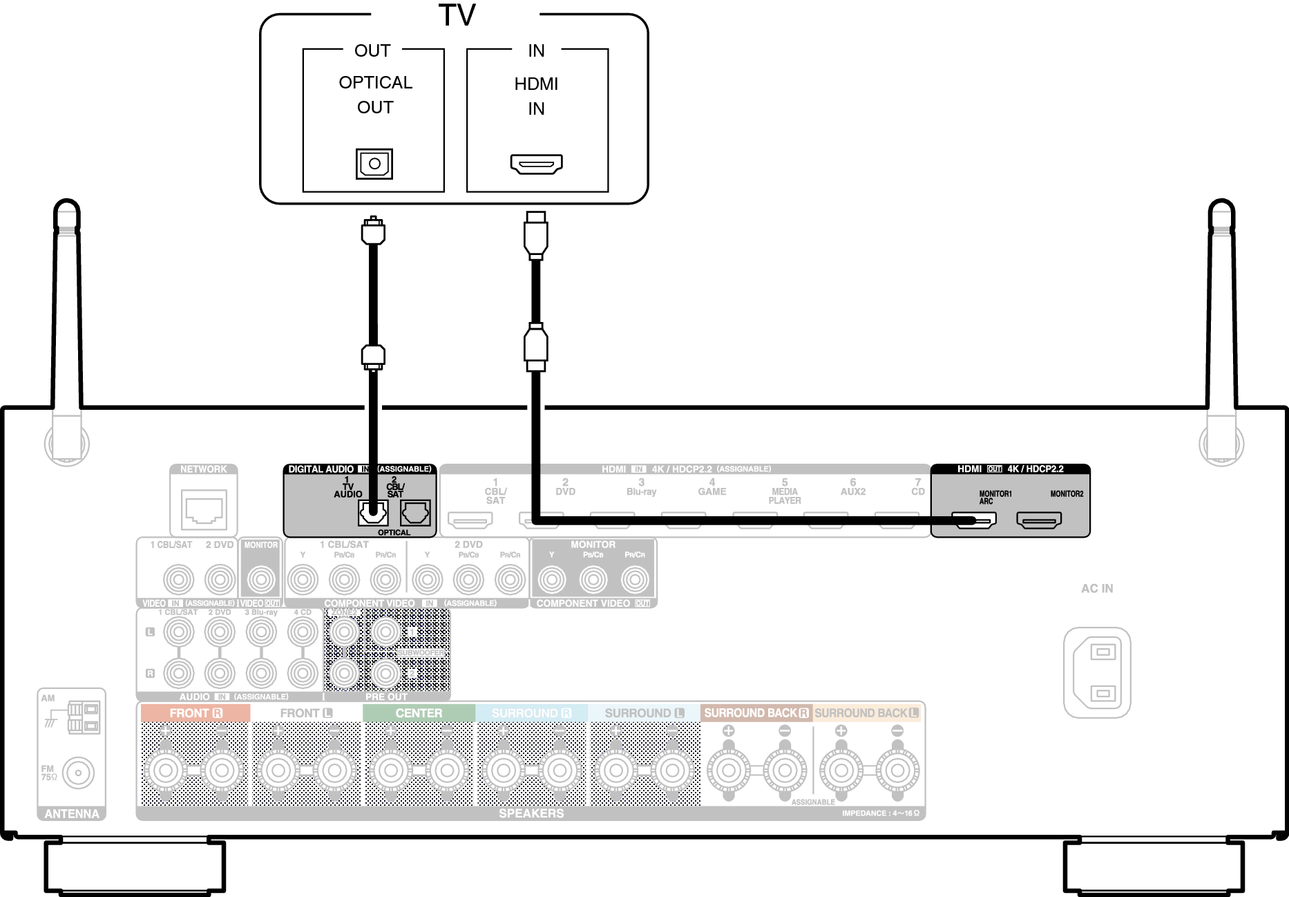 Aansluiting 2: tv uitgerust met een HDMI-aansluiting en niet compatibel met ARC (Audio Return Channel)