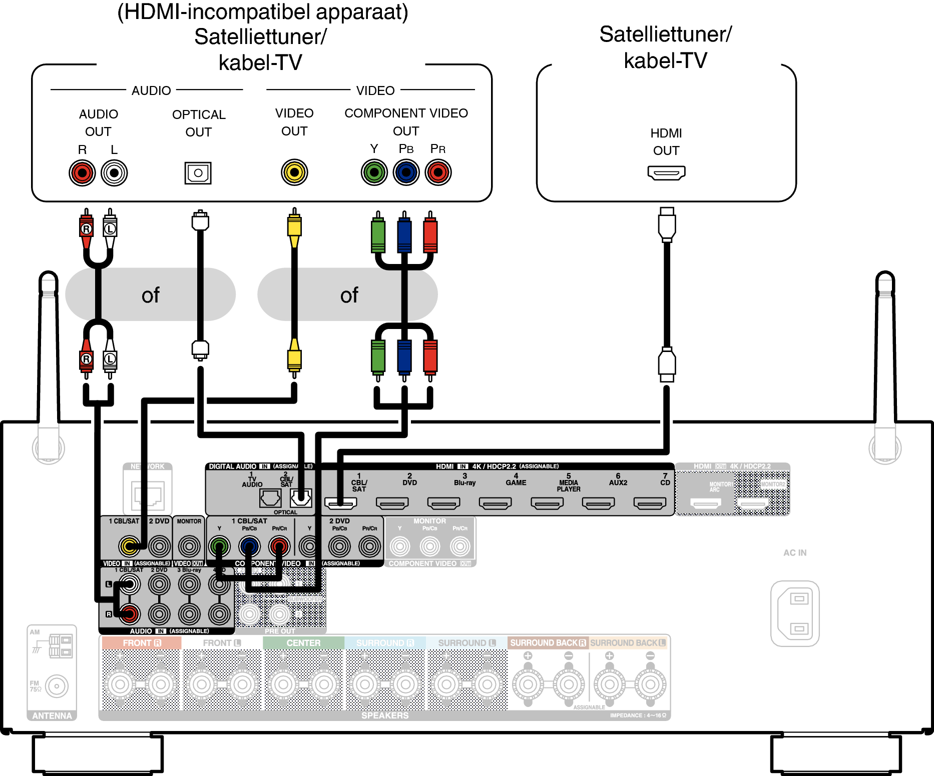 Deze toelichting gebruikt de aansluiting met een satelliettuner/kabel-tv STB als voorbeeld.
