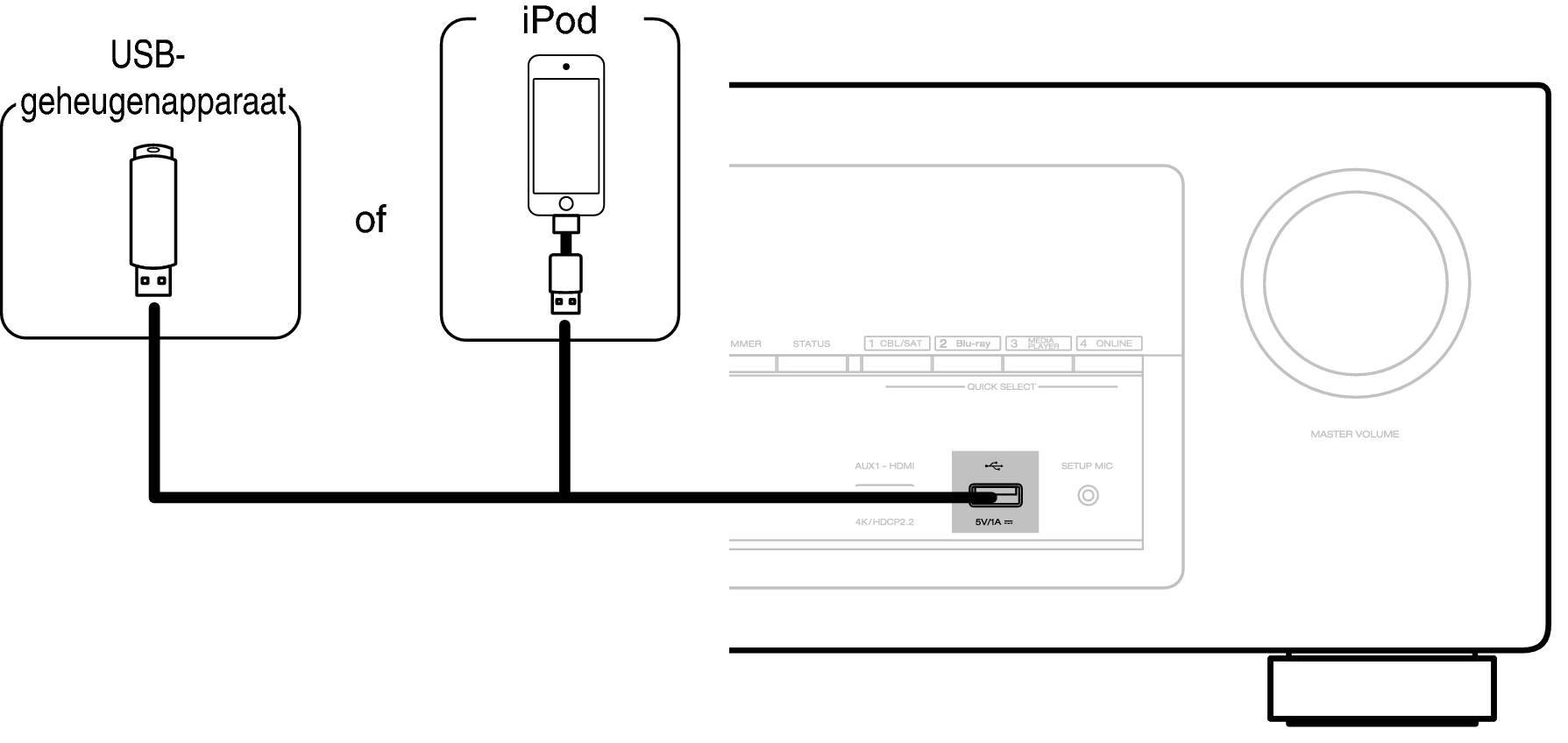 Denon kan niet garanderen dat alle USB-geheugenapparaten zullen werken of stroom zullen krijgen. Wanneer u een draagbare USB harde schijf (HDD) gebruikt die met een voedingsadapter is geleverd, moet u de bijgeleverde voedingsadapter van dat apparaat gebruiken.