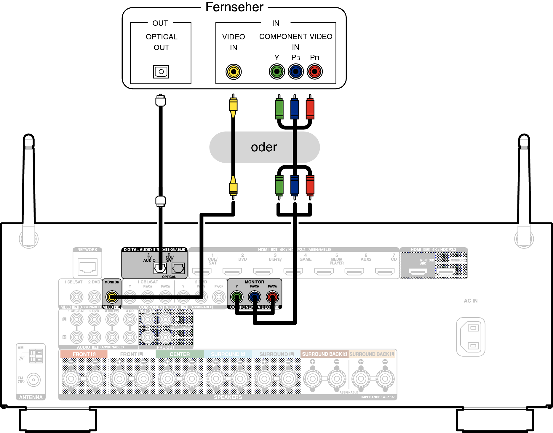 Verwenden Sie ein Component Video- oder ein Video-Kabel, um den Fernseher an dieses Gerät anzuschließen.