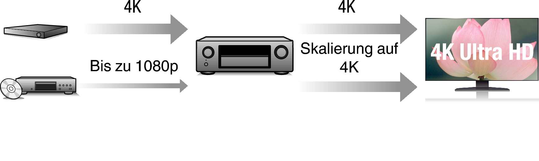 Dieses Gerät ist mit einer Funktion zur Aufwärtsskalierung für 4K-Videodaten ausgestattet, sodass Sie SD-Videos (Standard Definition) über HDMI mit 4K-Auflösung (3840 × 2160 Pixel) ausgeben können. Mit dieser Funktion können Sie das Gerät über ein einzelnes HDMI-Kabel an einen Fernseher anschließen und so hochauflösende Bilder für jede Videoquelle erzeugen.