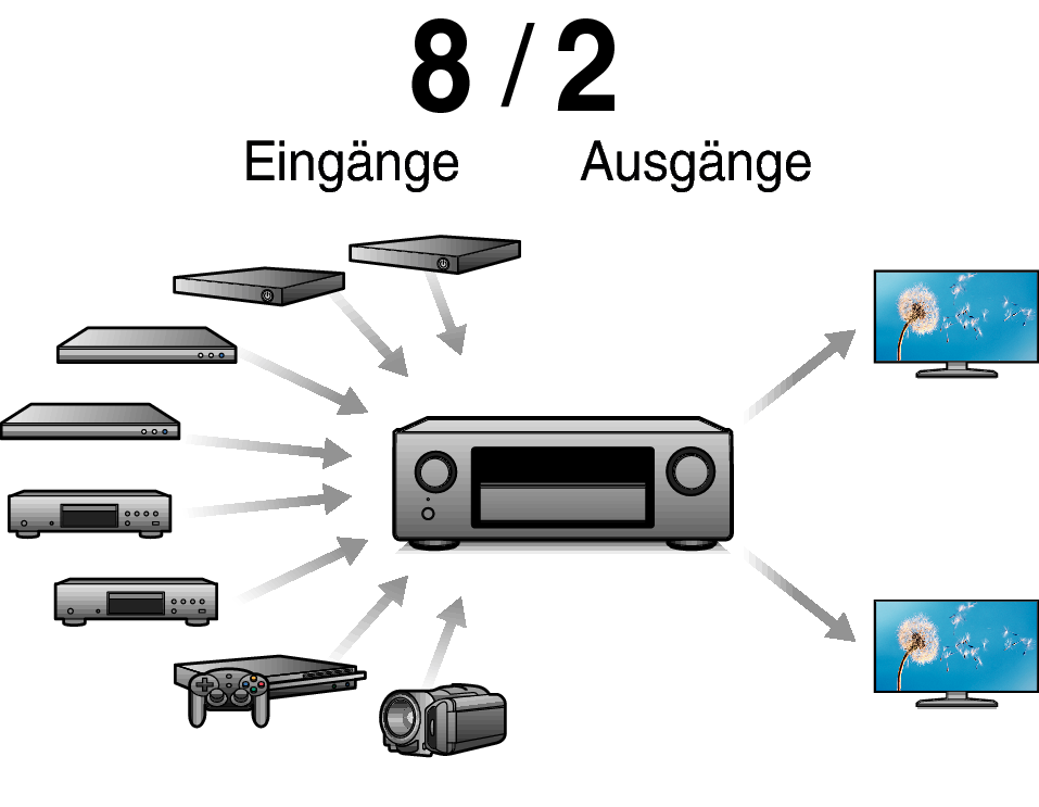 HDMI-Anschlüsse ermöglichen Anschlüsse an zahlreiche AV-Geräte (8 Eingänge, 2 Ausgänge)
