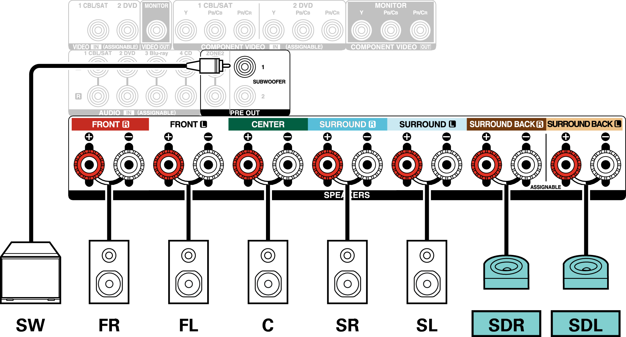 Wenn Sie nur einen Surround-Back-Lautsprecher verwenden, schließen Sie ihn am Anschluss SURROUND BACK L an.
