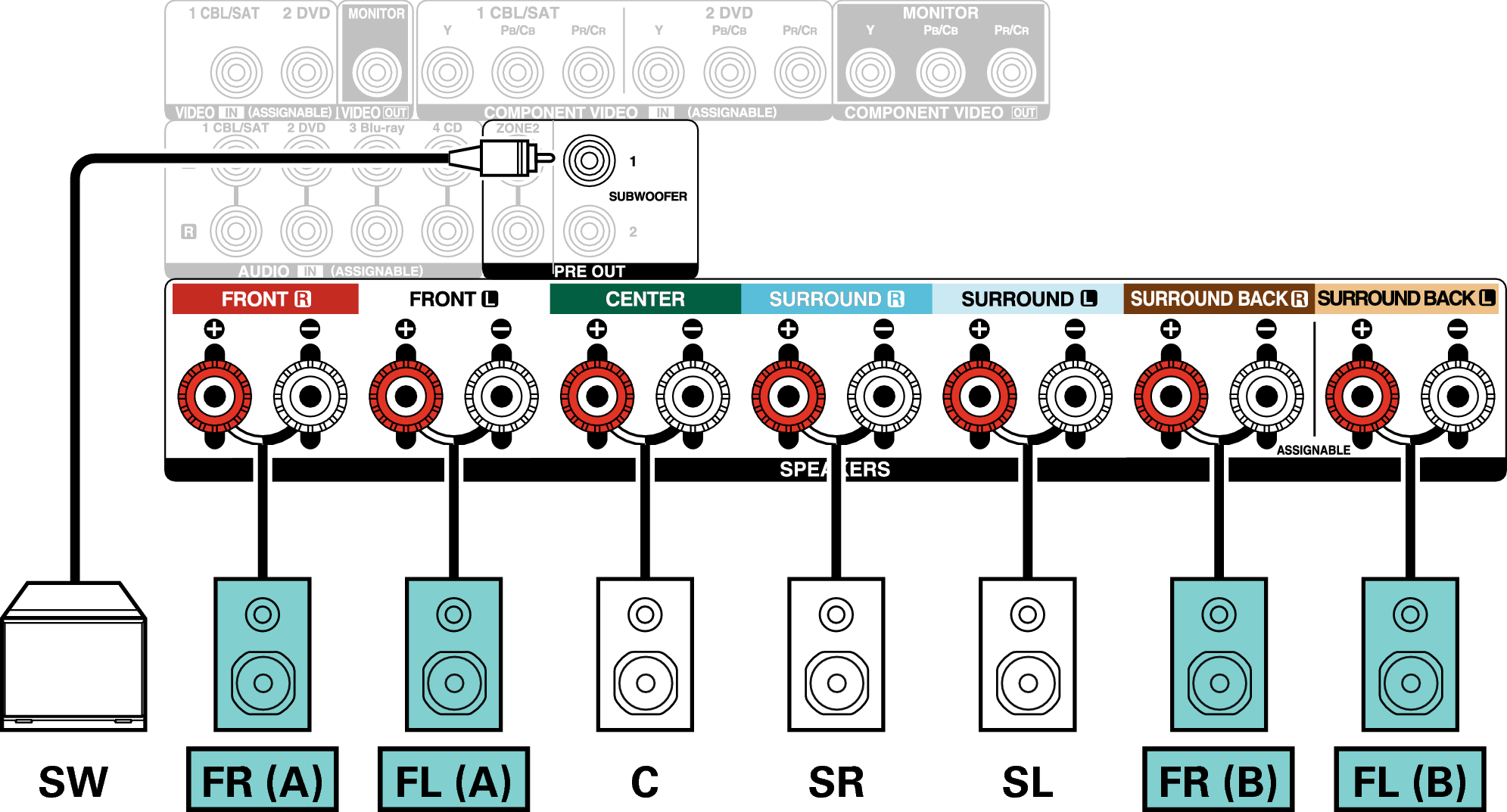 Ce système permet la commutation de la lecture entre les enceintes avant A et B, comme vous le souhaitez.