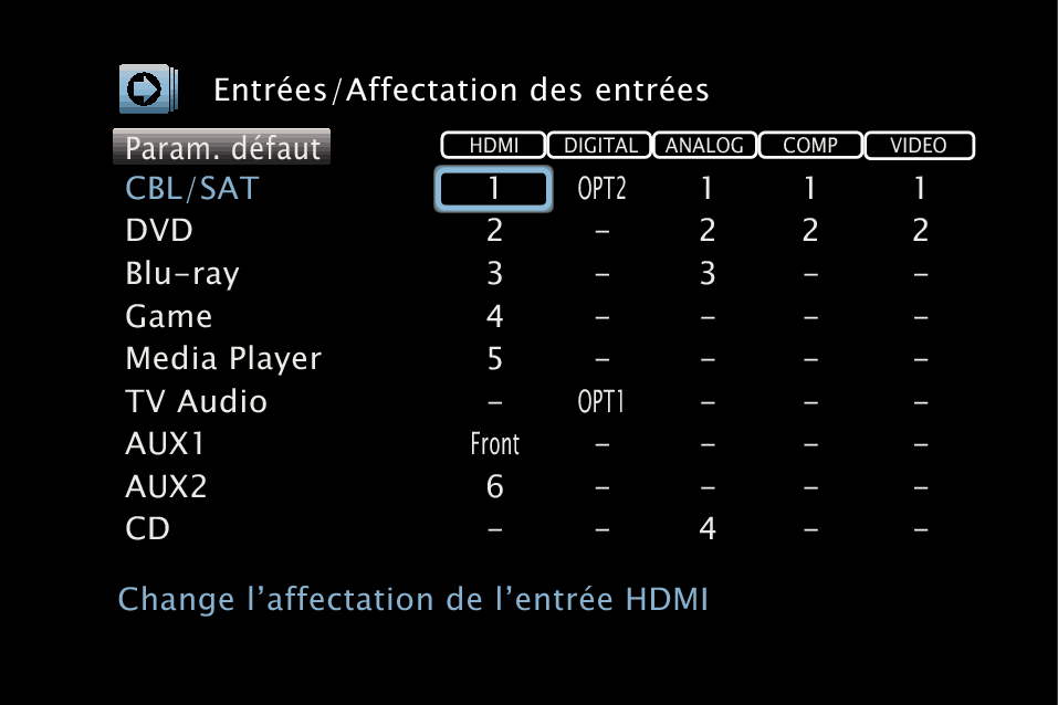 Veuillez changer l’attribution de la borne d’entrée HDMI, de la borne d’entrée audio numérique, de la borne d’entrée audio analogique, de la borne d’entrée de la vidéo composante, et de la borne d’entrée vidéo lors de la connexion d’une source d’entrée qui diffère de ce qui est imprimé sur les borne d’entrée audio/vidéo de cet appareil.