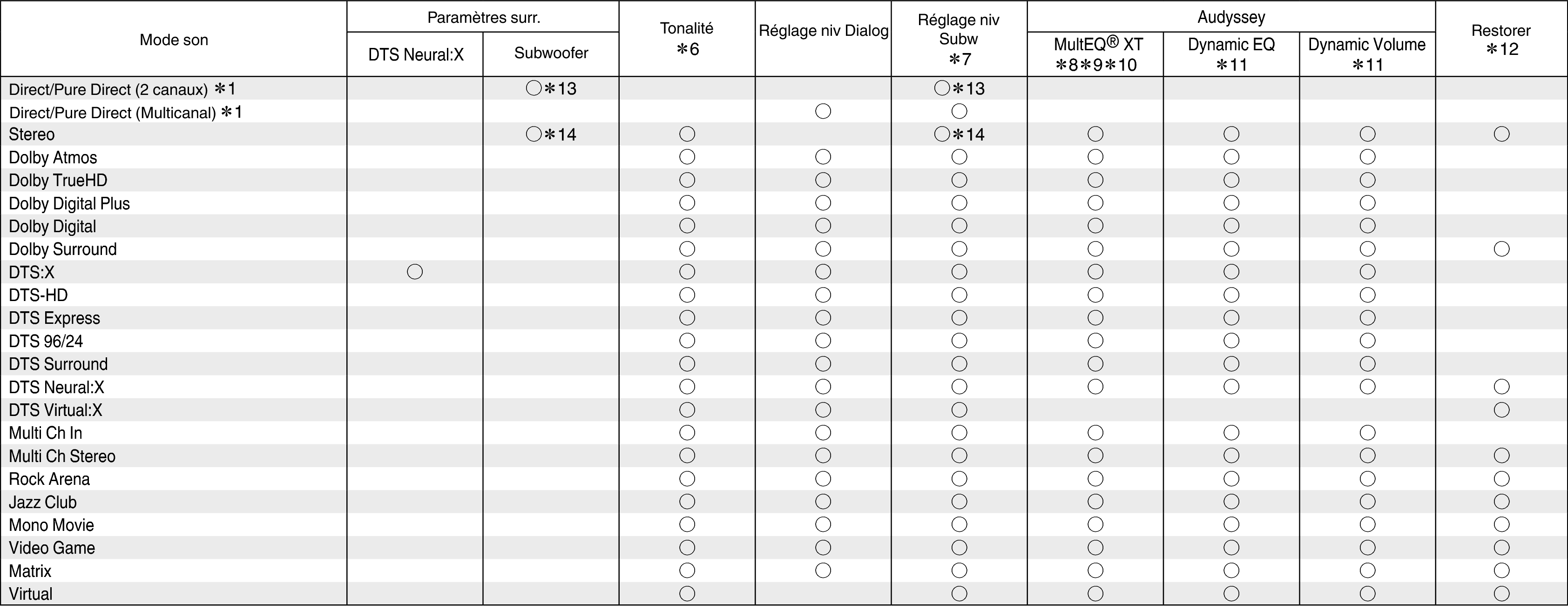 ∗1, ∗6 - ∗14 : Modes audio et paramètres surroundlien