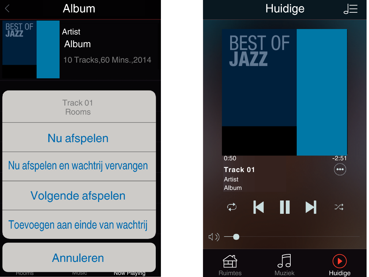Na het selecteren van een muzieknummer of radiostation zal de app automatisch naar het “Huidige” scherm gaan.