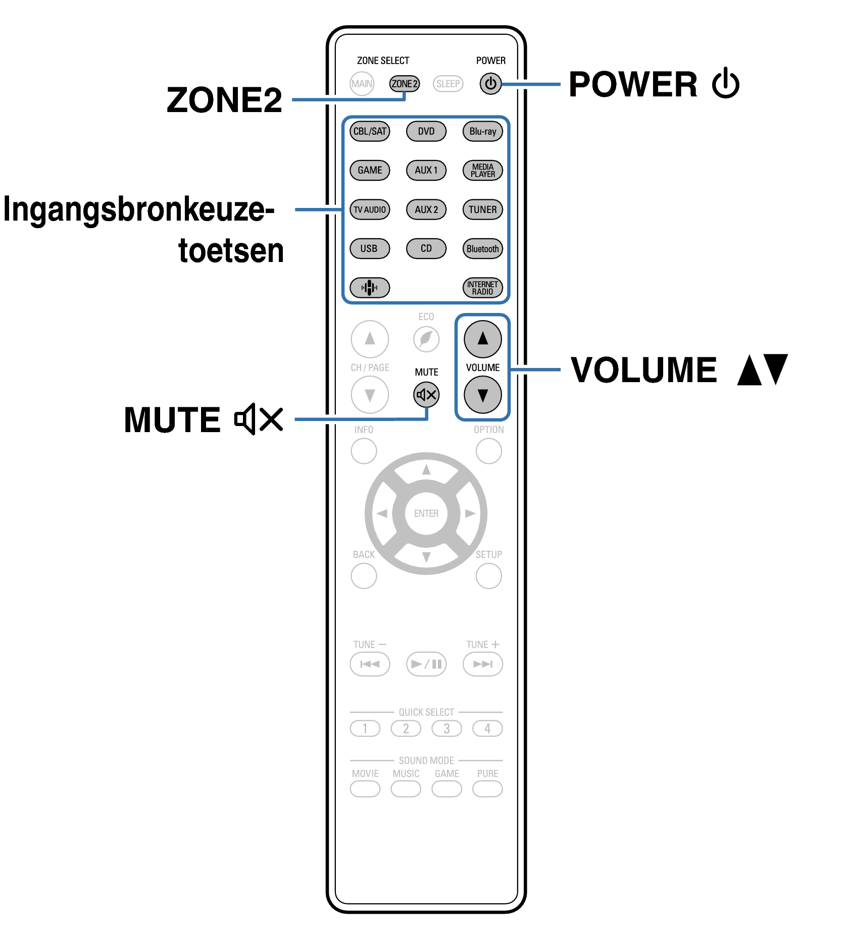 Druk op ZONE2 SOURCE om een bewerking uit te voeren met het hoofdtoestel. Telkens wanneer u op ZONE2 SOURCE drukt, verandert de ingangsbron.
