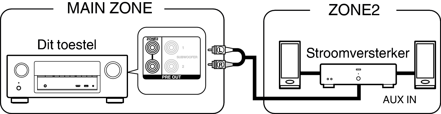 De audiosignalen van de ZONE2 audio-uitgangen van dit toestel worden uitgevoerd naar de ZONE2-versterkers en weergegeven op deze versterkers.