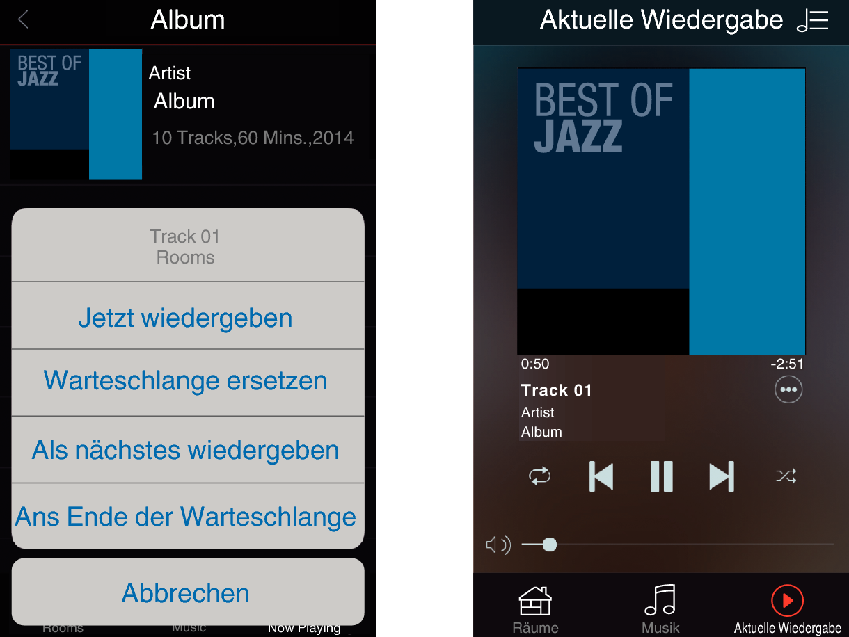 Nach Auswahl eines Musiktitels oder eines Radiosenders wechselt die App automatisch zum Bildschirm “Aktuelle Wiedergabe”.