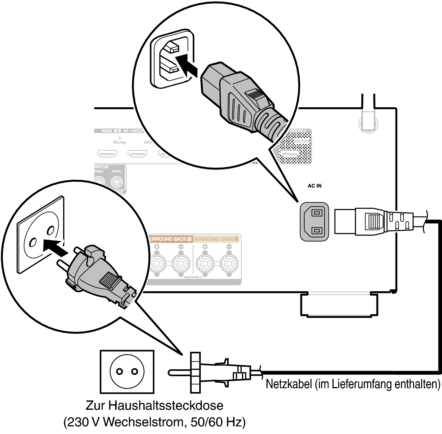 Wenn alle Anschlüsse hergestellt wurden, schließen Sie den Netzstecker an die Steckdose an.