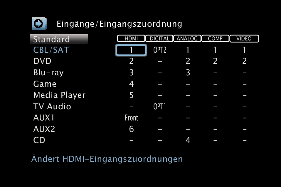 Ändern Sie die Zuordnung des HDMI-Eingangsanschlusses, des digitalen Audioeingangsanschlusses, des analogen Audioeingangsanschlusses, des Component Video-Eingangsanschlusses und des Videoeingangsanschlusses, wenn Sie eine andere Eingangsquelle anschließen als die aufgedruckten Audio-/Videoeingangsanschlüsse dieses Geräts.