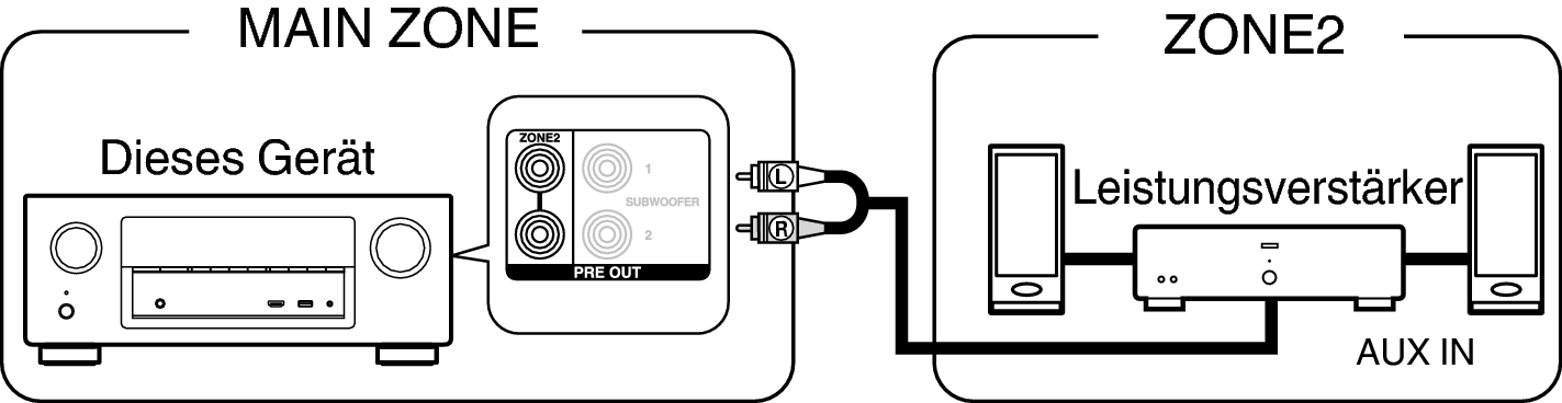 Die Audiosignale an den Audioausgängen von ZONE2 des Geräts werden über die Verstärker für ZONE2 ausgegeben und mit diesen Verstärkern wiedergegeben.
