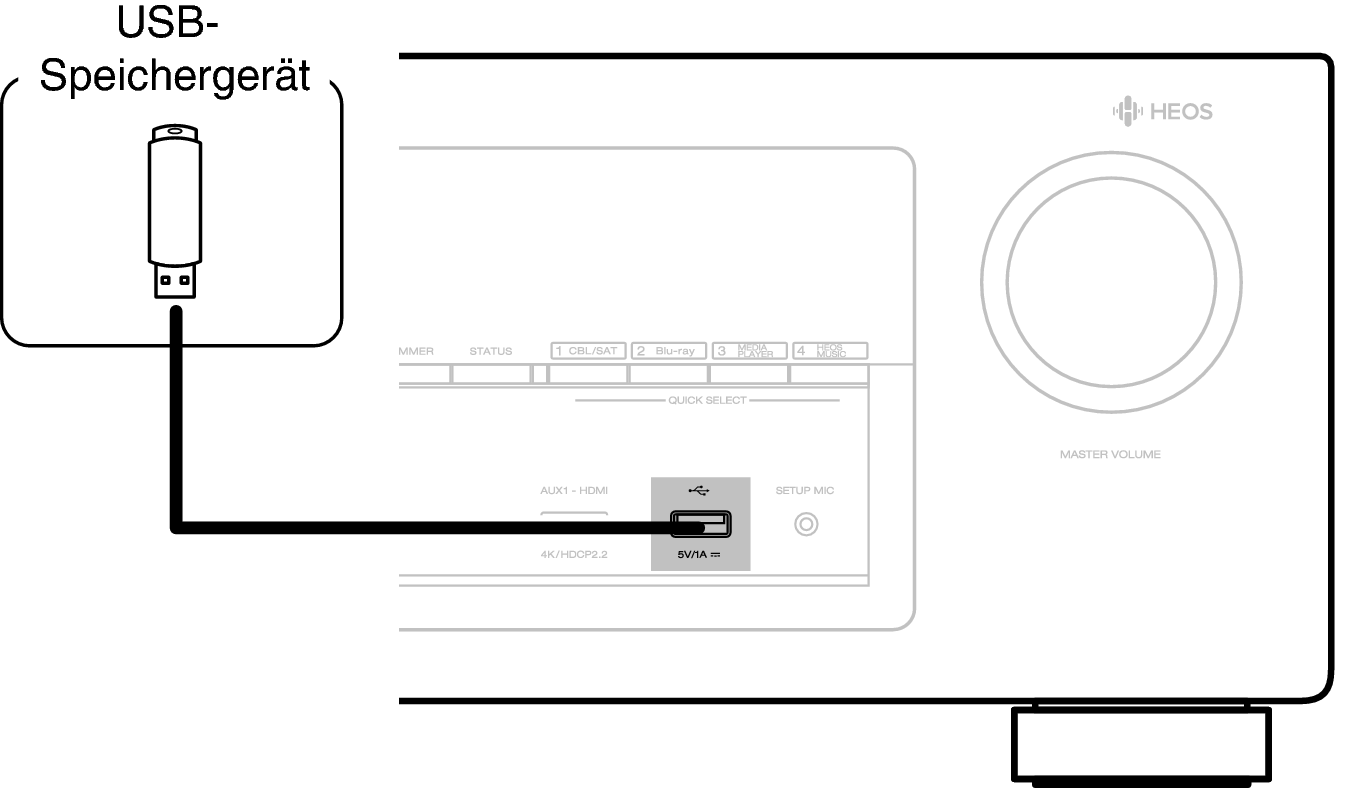 Denon kann nicht garantieren, dass alle USB-Speicher verwendet oder mit Strom versorgt werden können. Wenn Sie ein mobiles USB-Festplattenlaufwerk verwenden, das über einen Netzadapter verfügt, verwenden Sie diesen.