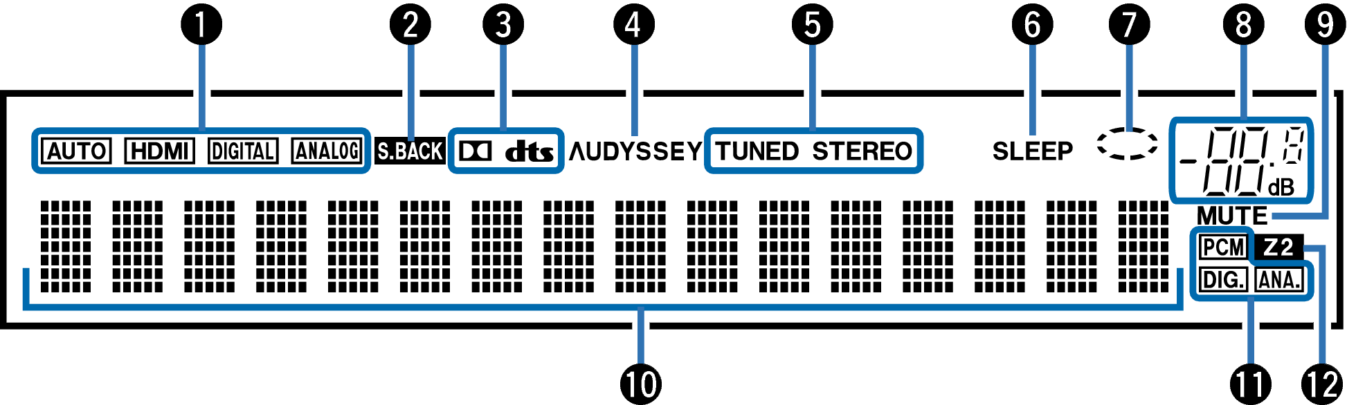 输入源设为“Tuner”时,这些指示灯将根据接收条件进行显示。