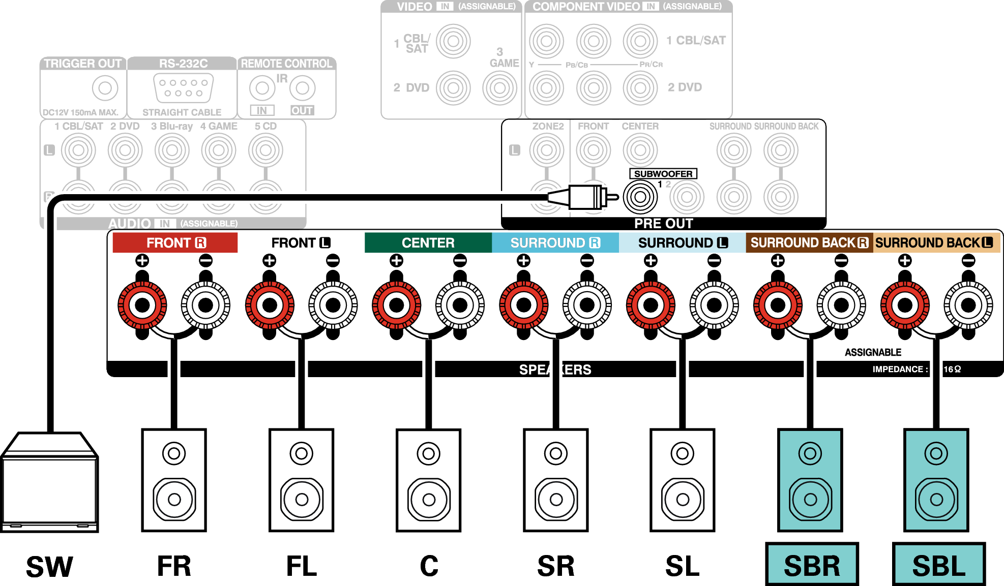 To urządzenie posiada wbudowany 7-kanałowy wzmacniacz mocy. Oprócz podstawowego systemu 5.1-kanałowego, rozmaite systemy, takie jak systemy 7.1-kanałowe, połączenia bi-amp i 2-kanałowe systemy dla odtwarzania wielostrefowego, mogą zostać skonfigurowane poprzez zmianę ustawień “Przypisanie wzmacniacz.”link, aby dostosować je do aplikacji.