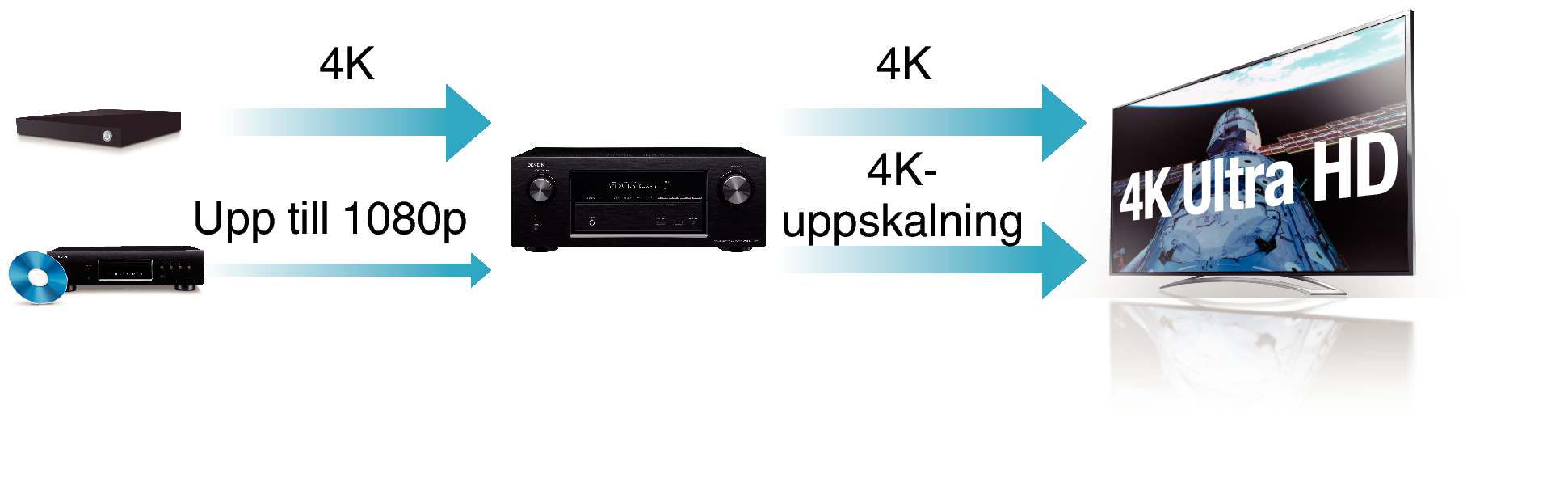 Den här enheten har en funktion för 4K-uppskalning av video som gör att analog- eller SD (Standardupplöst)-TV kan sändas via HDMI i 4K (3840 × 2160 pixlar)-upplösning. Funktionen låter enheten vara ansluten till en TV via en enda HDMI-kabel som tillåter högupplösta bilder oavsett videokälla.