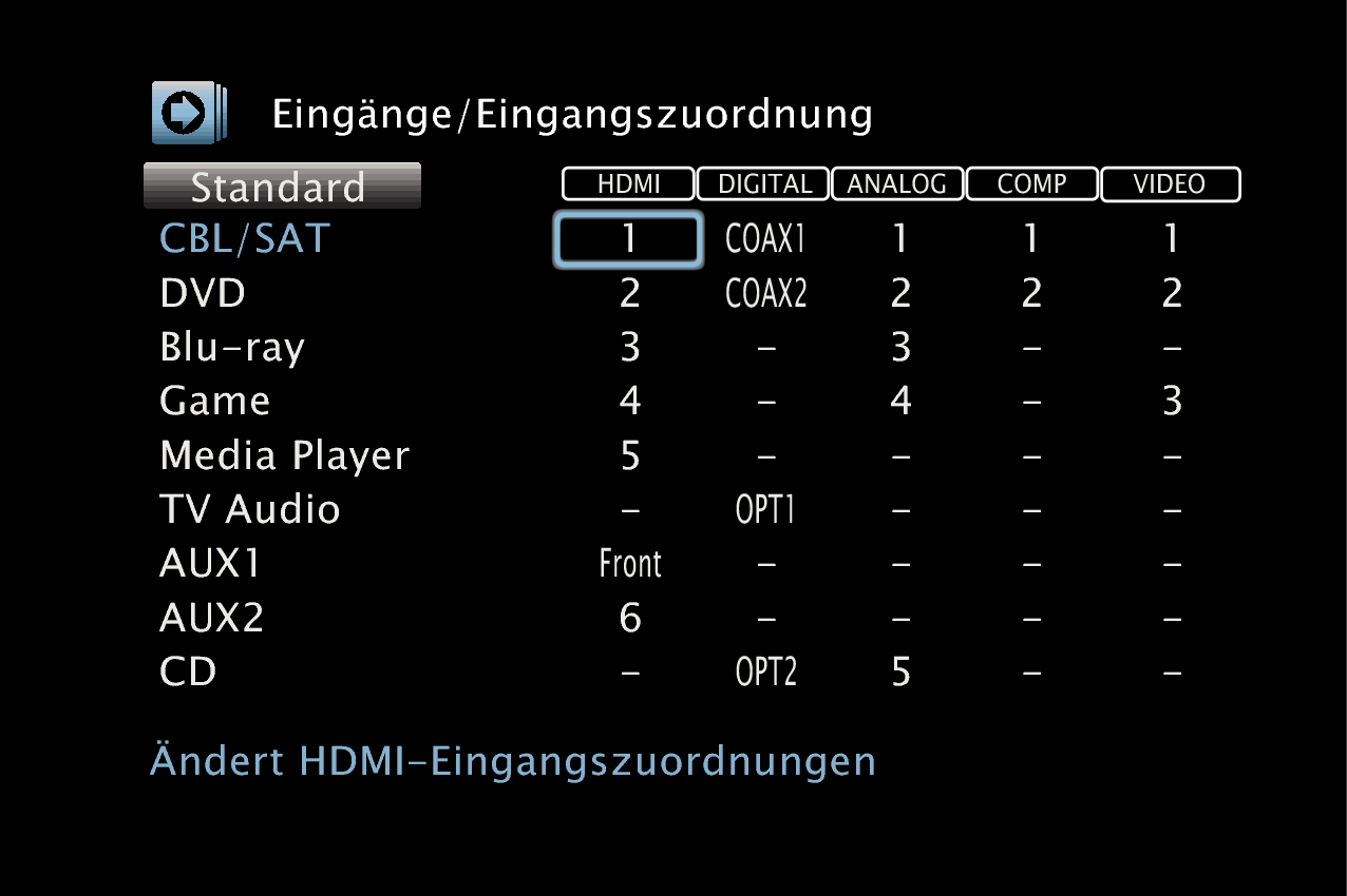 Ändern Sie die Zuordnung des HDMI-Eingangsanschlusses, des digitalen Audioeingangsanschlusses, des analogen Audioeingangsanschlusses, des Component Video-Eingangsanschlusses und des Videoeingangsanschlusses, wenn Sie eine andere Eingangsquelle anschließen als die aufgedruckten Audio-/Videoeingangsanschlüsse dieses Geräts.