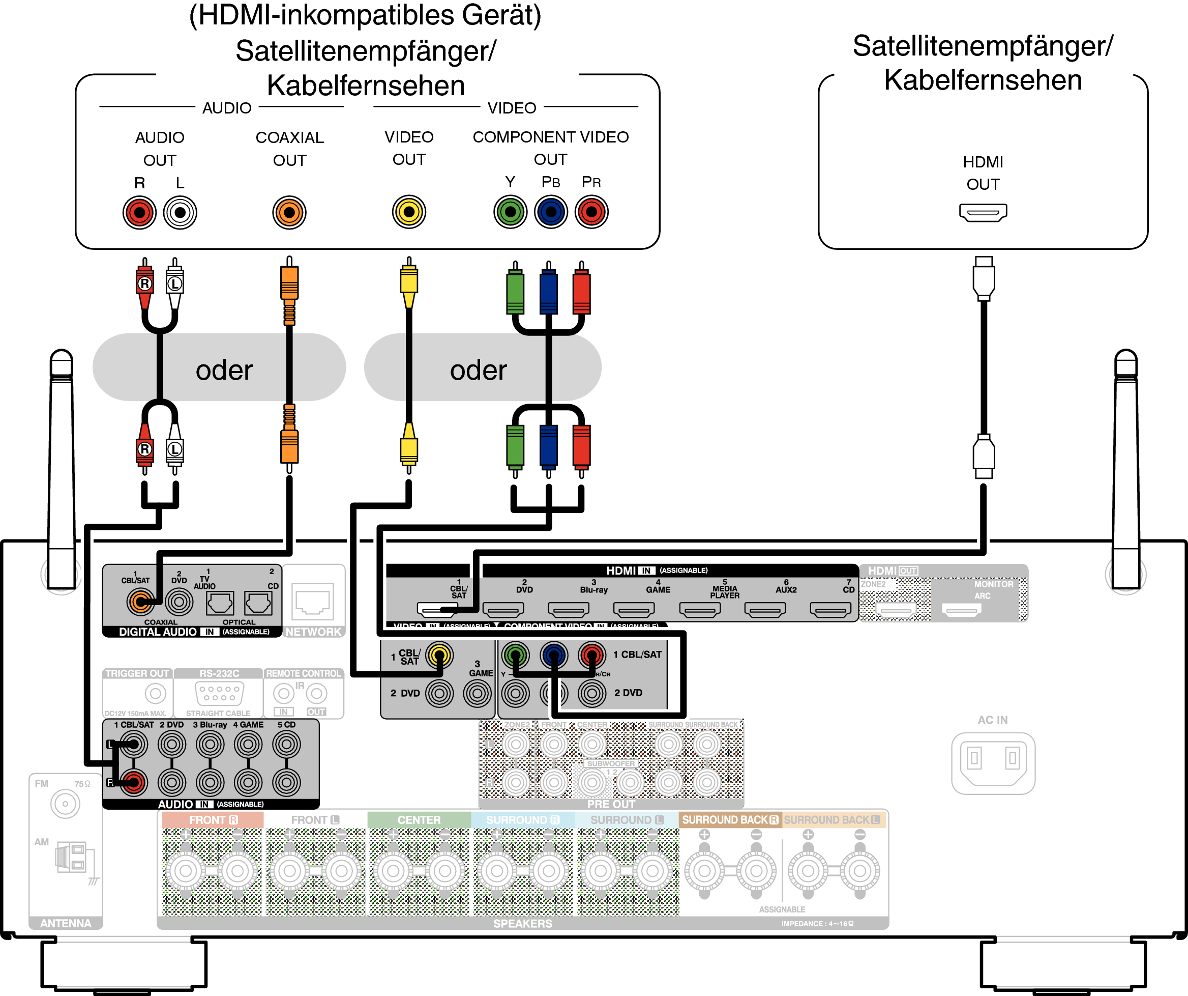 In diesem Beispiel wird der Anschluss einer Satellitenempfänger-/Kabelfernsehen-STB erläutert.