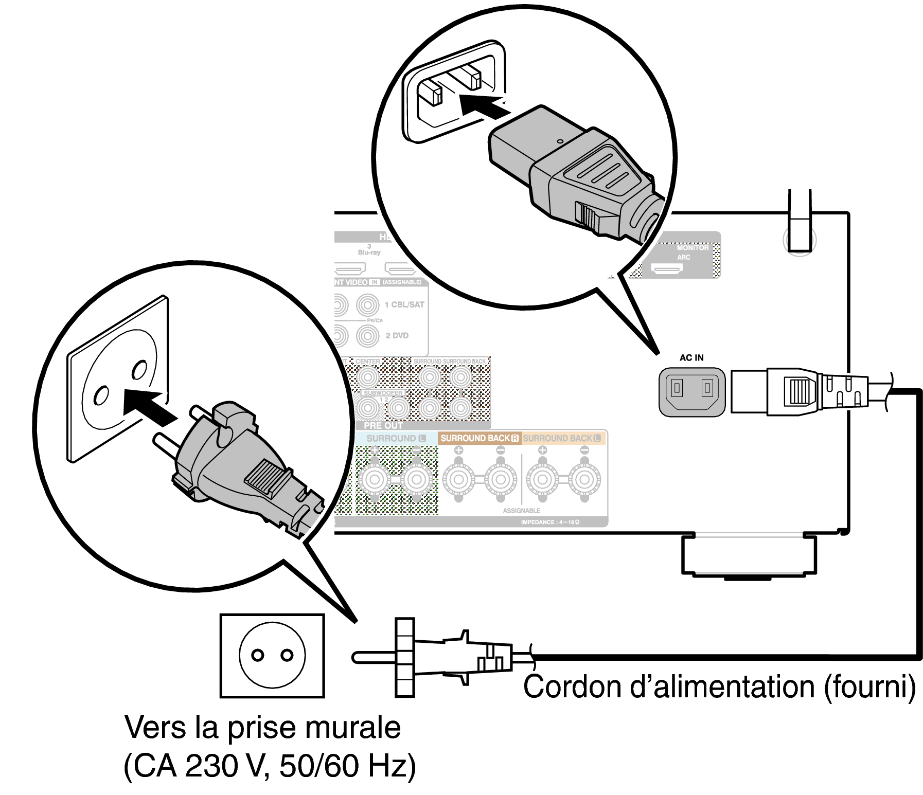 Une fois toutes les connexions effectuées, insérez la fiche d’alimentation dans la prise murale.