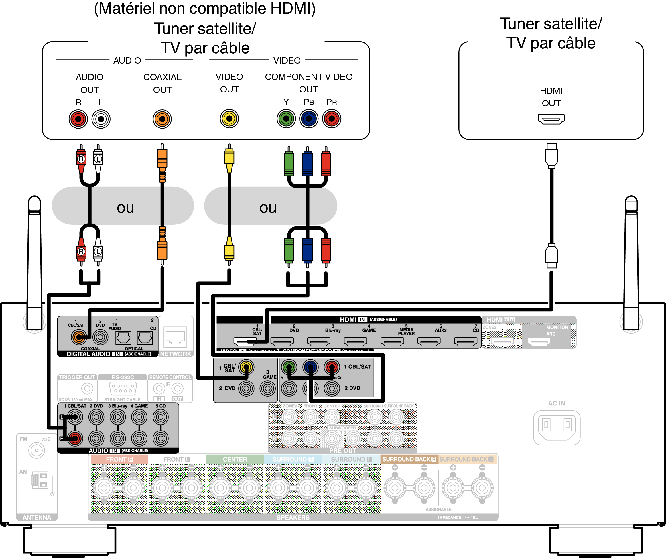 Cette explication utilise la connexion avec un tuner satellite/câble TV STB comme exemple.