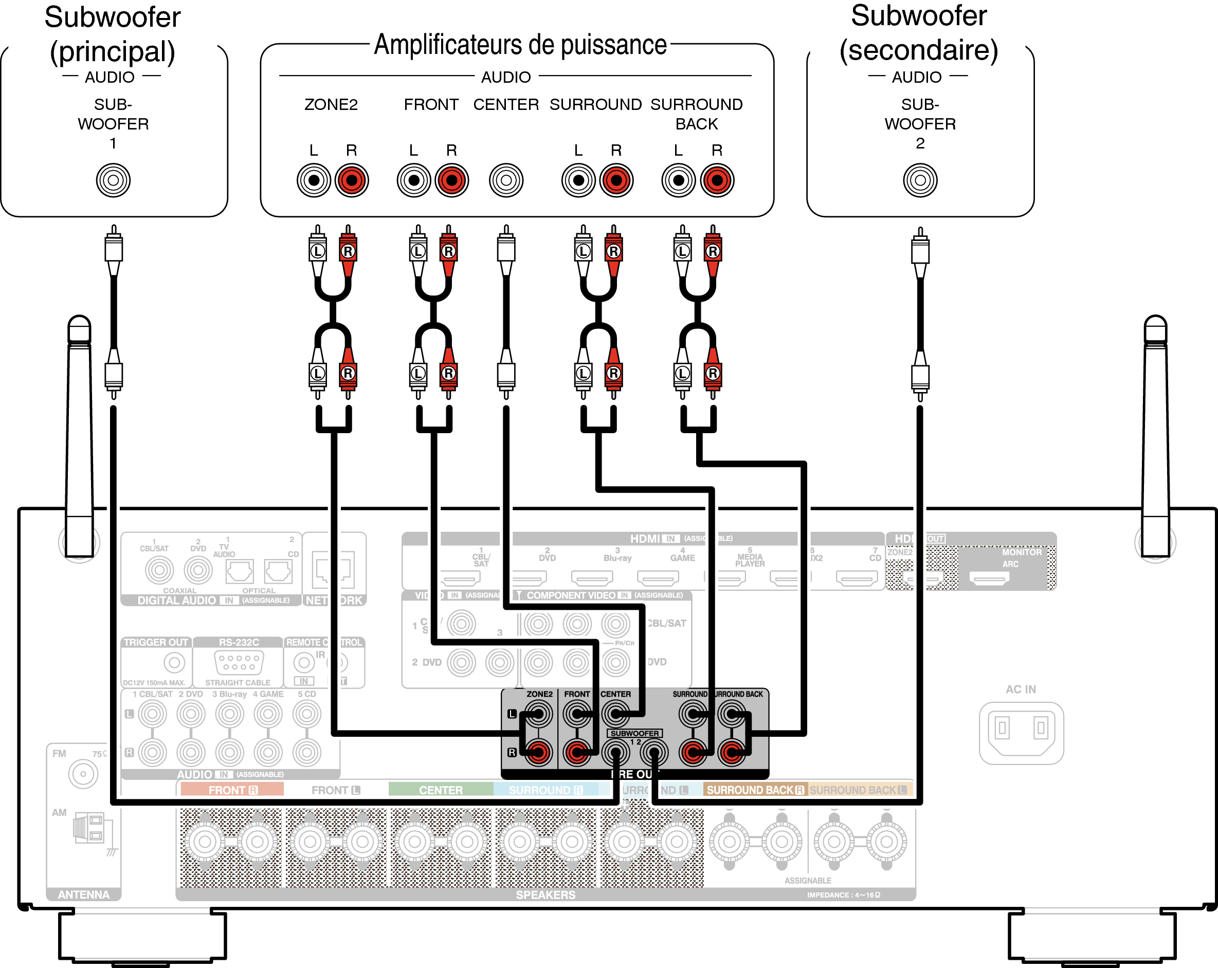 Cette méthode de connexion construit un système d’enceinte à canaux 5.1 dans la MAIN ZONE et un système à 2 canaux dans la ZONE2.