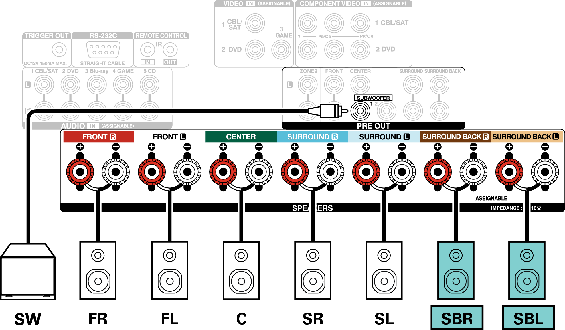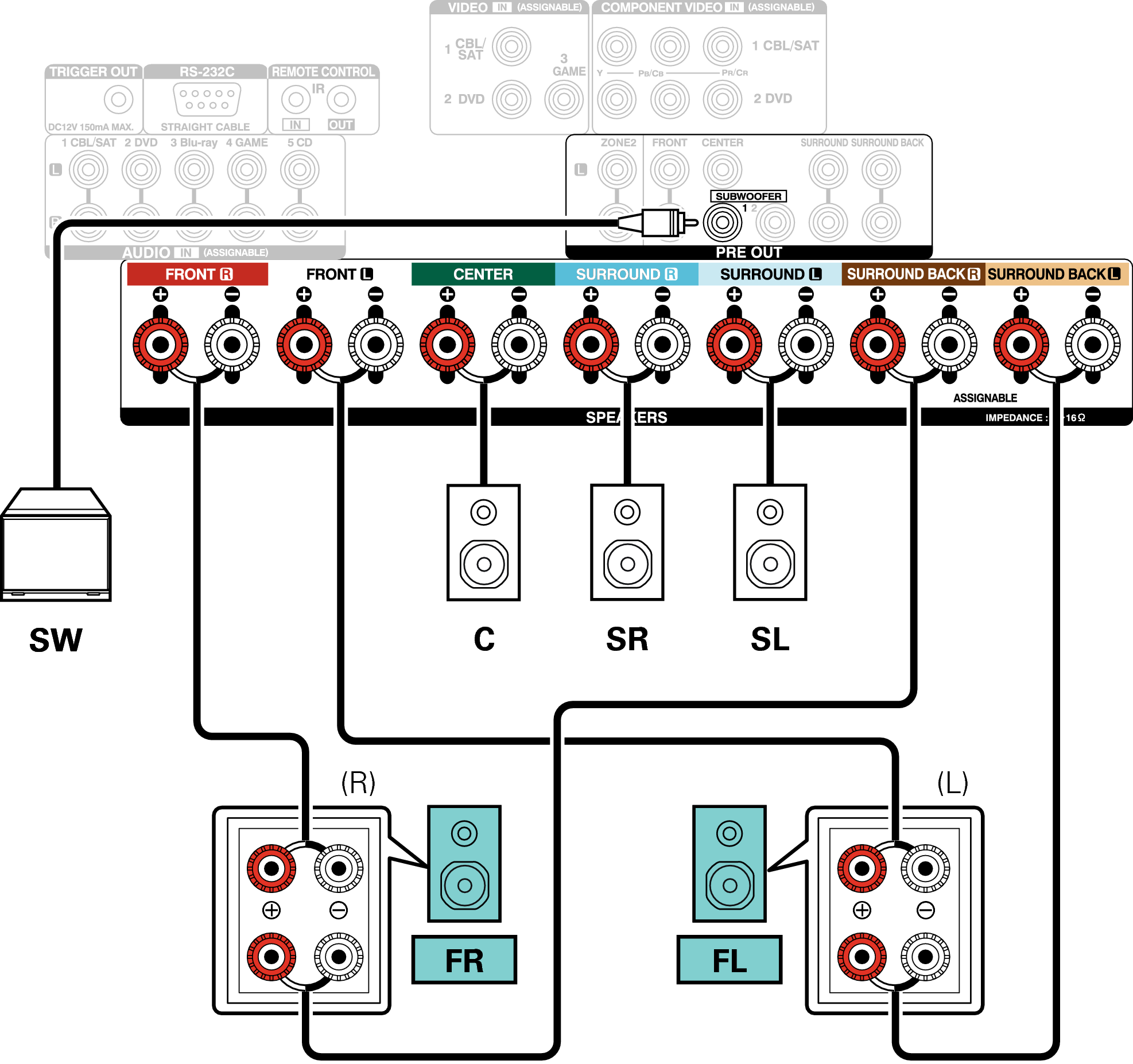 Lorsque vous utilisez une seule enceinte surround arrière, connectez-la à la borne SURROUND BACK L.