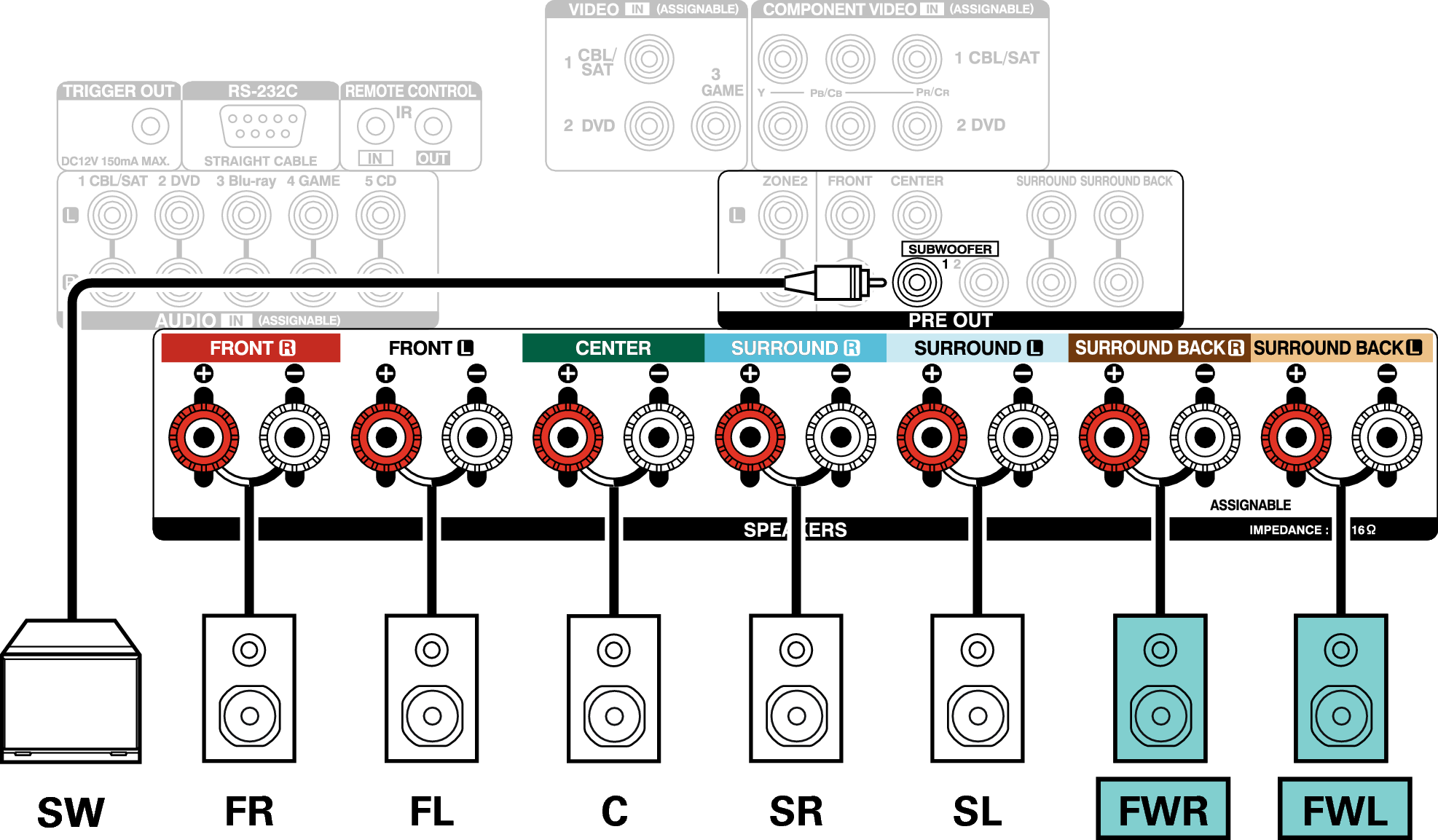 Cet appareil est équipé d’un amplificateur de puissance de canal 7. En plus du système du canal 5.1 de base, une variété de systèmes d’enceinte peut être configurée en changeant les paramétrages de “Affectation des Amplis”lien en fonction de l’application, par exemple les systèmes du canal 7.1, les connexions bi-amplificateur et les systèmes à 2 canaux pour la lecture multizone.