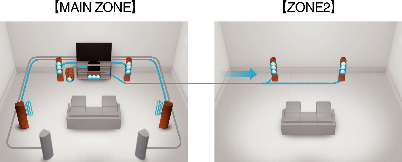 Wanneer de functie Alle zones Stereo wordt gebruikt, kunt u daarnaast in alle zones tegelijk genieten van muziek die in de MAIN ZONE wordt afgespeeld. Dit is nuttig wanneer u BGM wilt horen in het hele huis.
