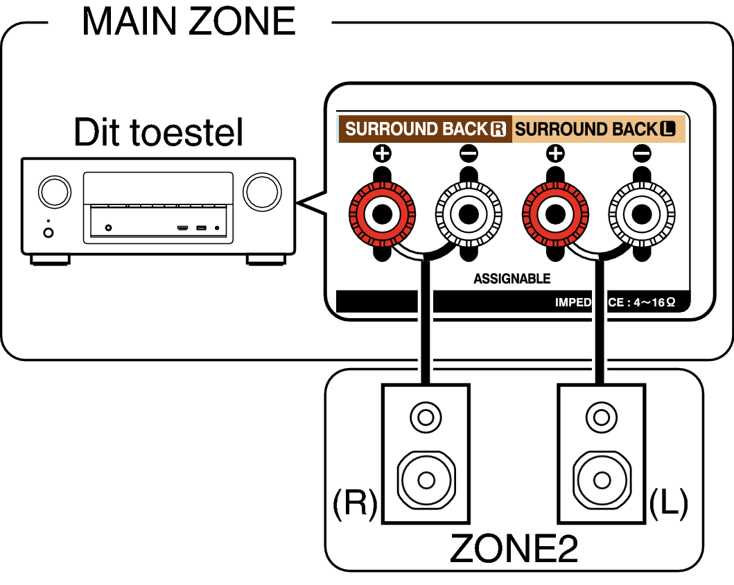Wanneer “Toewijsmodus”koppeling is ingesteld op “ZONE2” in het menu, wordt ZONE2-audio uitgevoerd vanaf de SURROUND BACK-luidsprekeraansluiting.