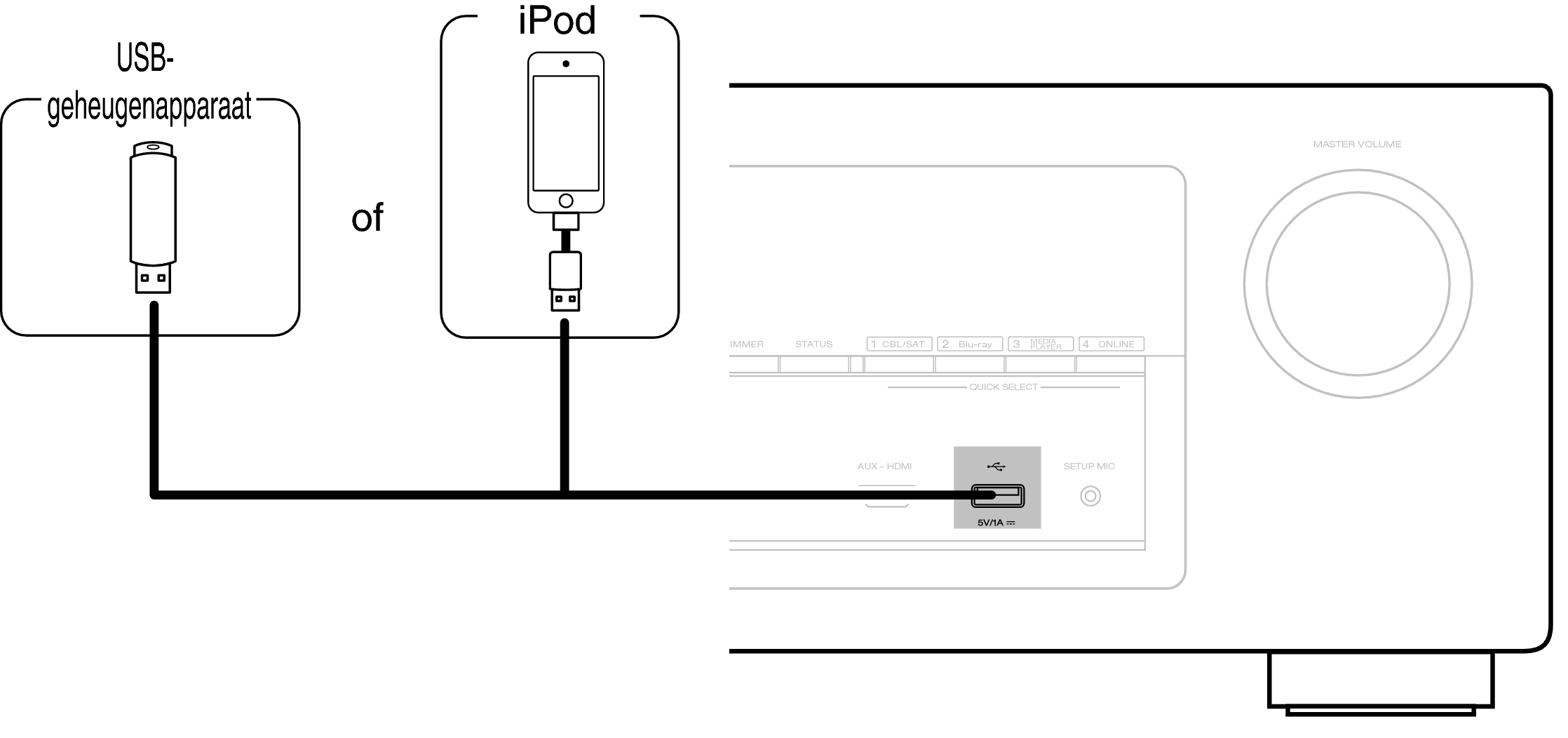 Denon kan niet garanderen dat alle USB-geheugenapparaten zullen werken of stroom zullen krijgen. Wanneer u een draagbare USB harde schijf (HDD) gebruikt die met een voedingsadapter is geleverd, moet u de bijgeleverde voedingsadapter van dat apparaat gebruiken.