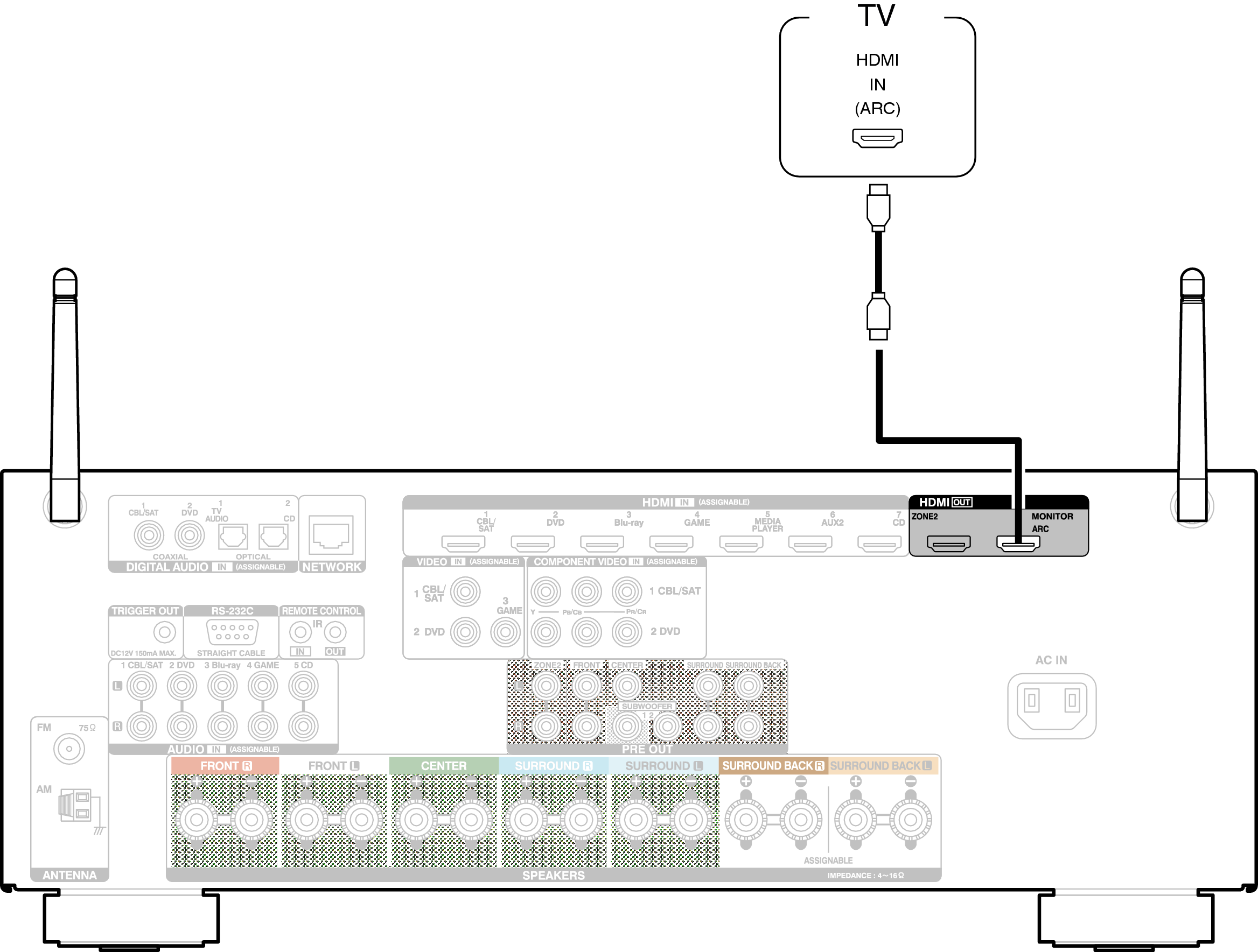 Gebruik een HDMI-kabel voor het aansluiten van een tv die compatibel is met de ARC-functie, op dit toestel.