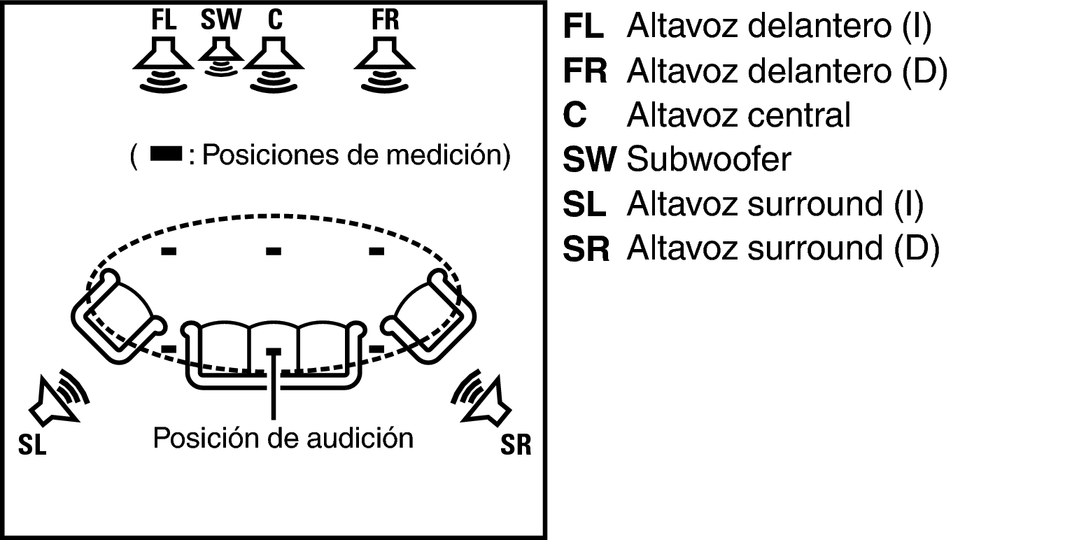 Para realizar la medición, coloque el micrófono de calibración de sonido en distintos puntos del área de audición. Para obtener los mejores resultados posibles, se recomienda realizar las mediciones en seis o más posiciones como se indica en la ilustración (hasta ocho posiciones).