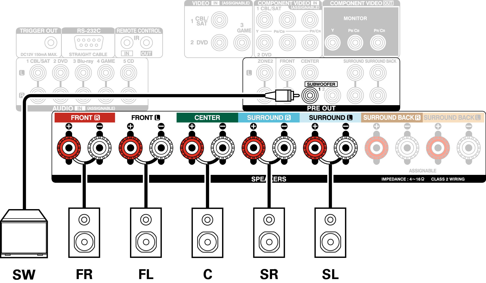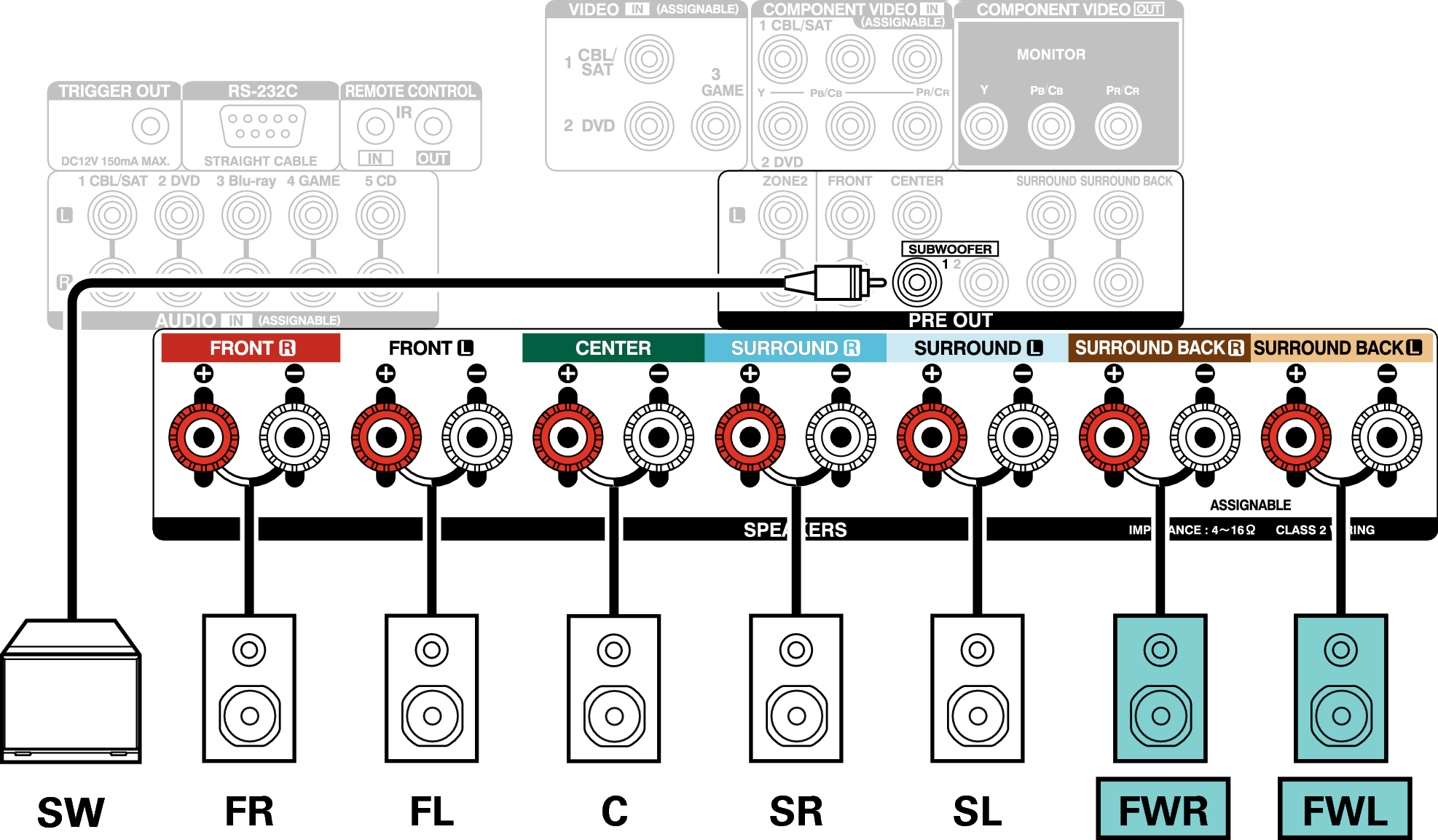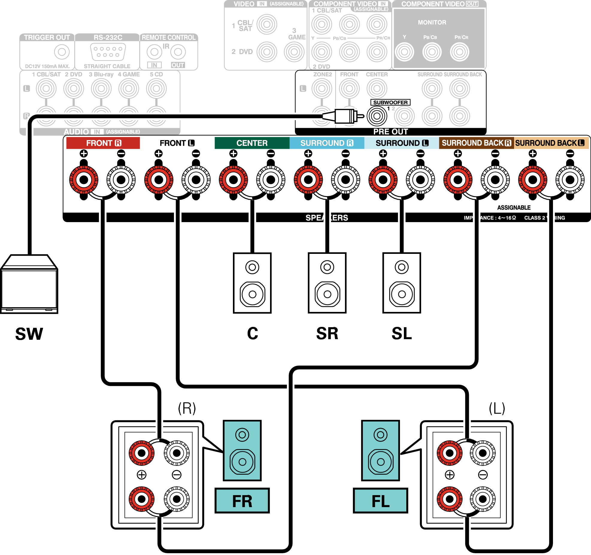 Si utiliza un solo altavoz surround trasero, conéctelo en el terminal SURROUND BACK L.