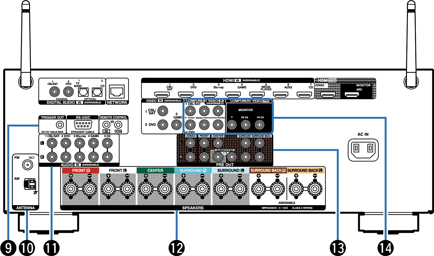 Ne touchez pas les broches internes des connecteurs sur le panneau arrière. Une éventuelle décharge électrique pourrait endommager de façon permanente votre appareil.