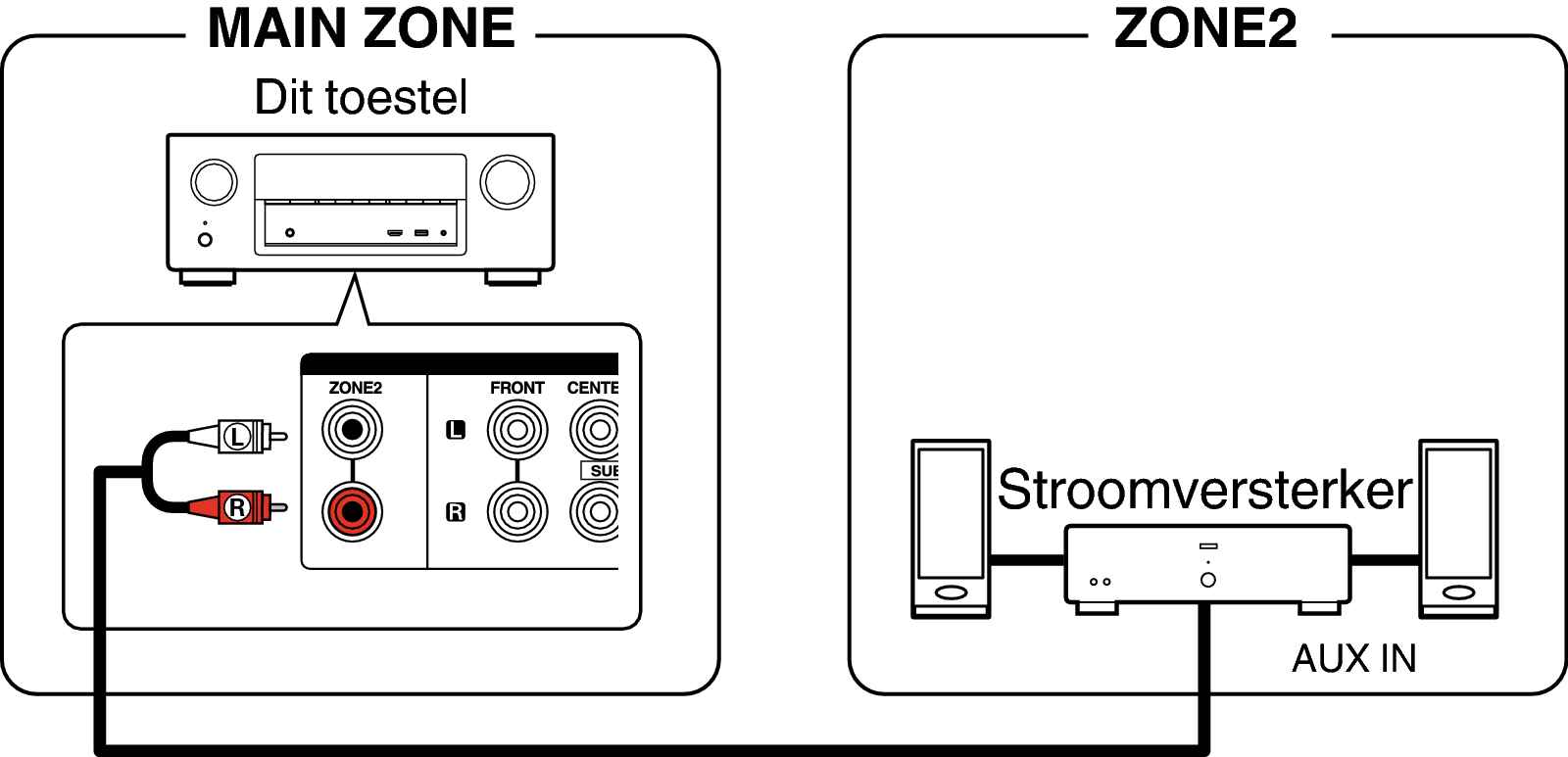De audiosignalen van de ZONE2 audio-uitgangen van dit toestel worden uitgevoerd naar de ZONE2-versterkers en weergegeven op deze versterkers.