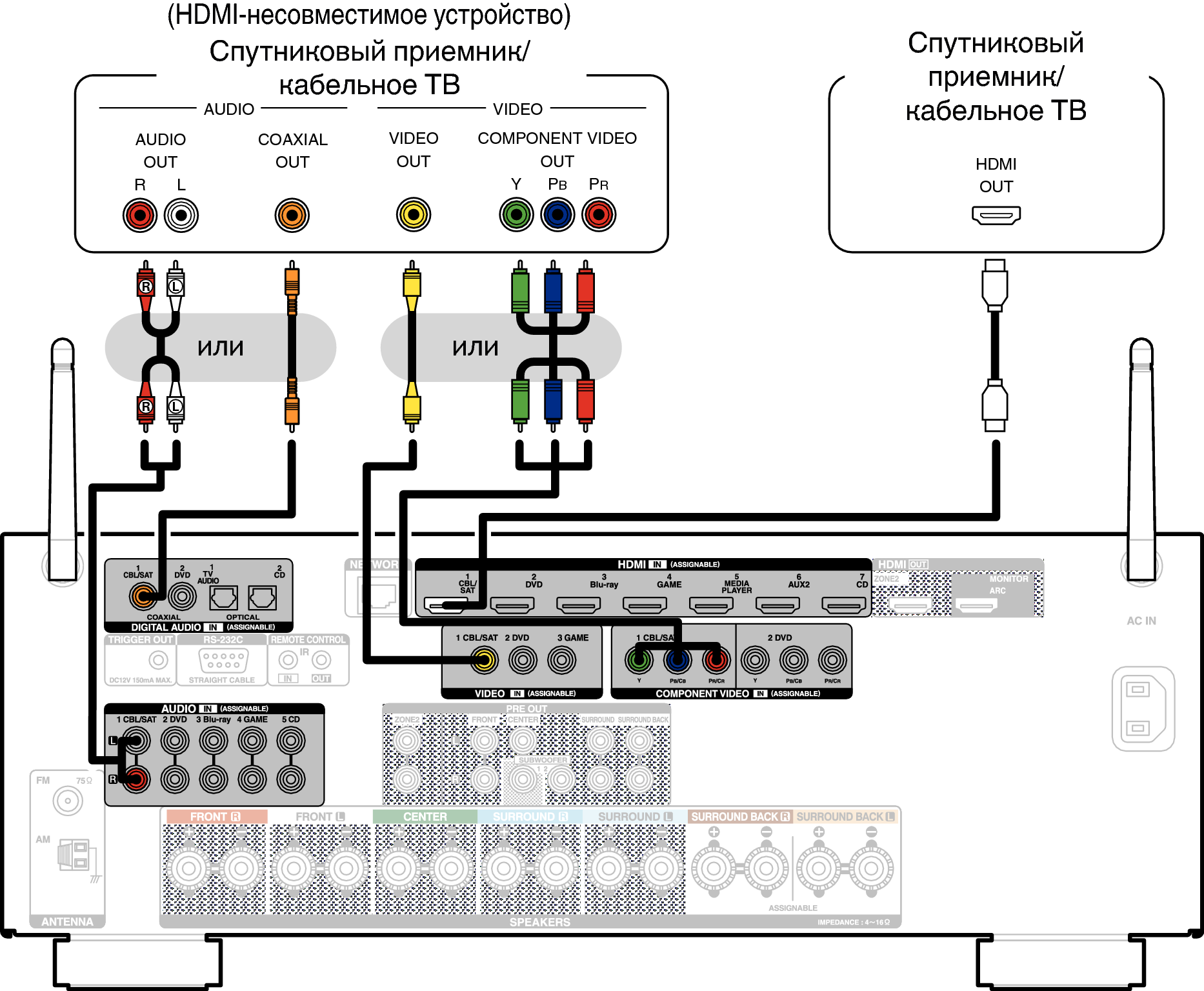 Подсоединение телеприставки (Спутниковый приемник/кабельное ТВ)