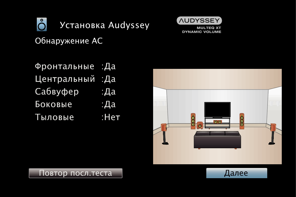 Не изменяйте соединение динамика или громкость сабвуфера после настройки Audyssey®. Если их изменили, запустите настройку Audyssey® снова для того, чтобы сконфигурировать оптимальные настройки эквалайзера.