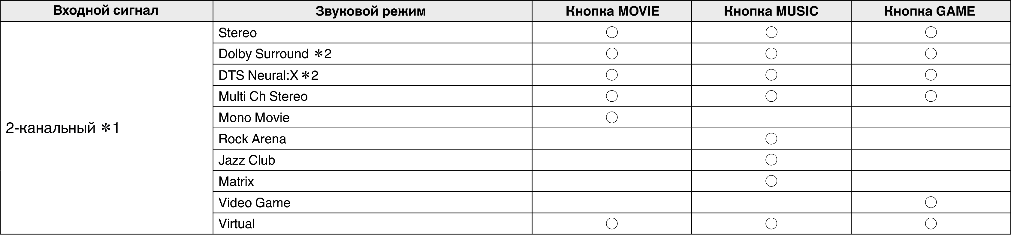 Режим звука, который можно выбрать, отличается в зависимости от аудио формата входного сигнала и количества каналов. Подробные сведения см. в разделе Типы входных сигналов и соответствующие режимы воспроизведения звукассылка.