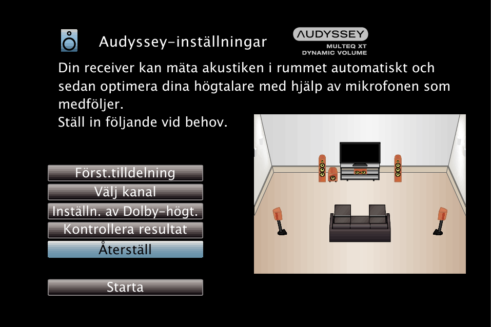 Om du anger “Återställ” till “Återställ” kan du återgå till mätresultatet för Audyssey®-inställningar (värdet som beräknades genom MultEQ® XT vid start) även om du har ändrat de olika inställningarna manuellt.
