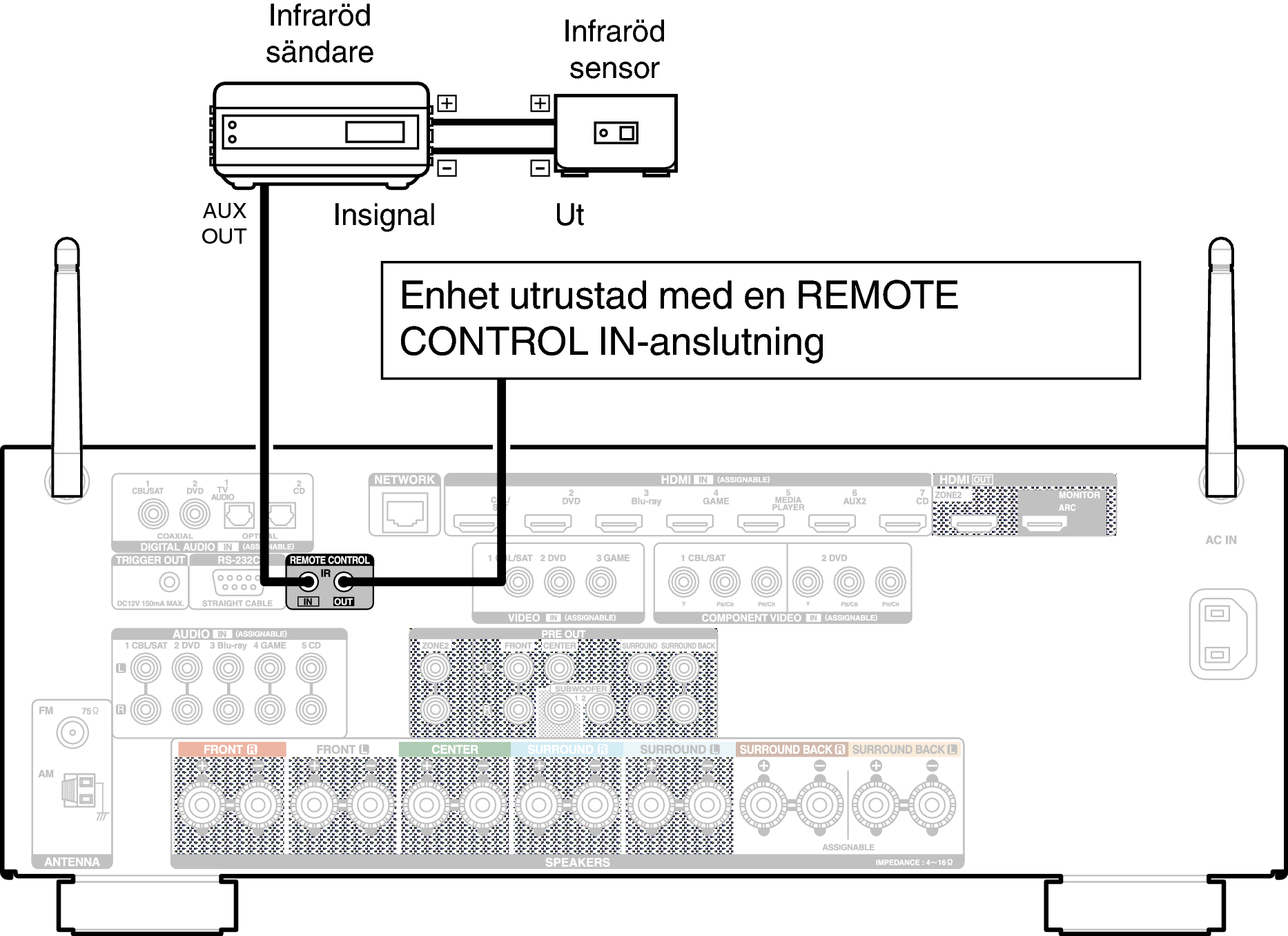 Om den här enheten installeras på en plats där fjärrkontrollens signal inte når (t.ex. installation i ett skåp) kan den fortfarande kontrolleras av en fjärrkontroll genom att ansluta en fjärrkontrollsmottagare (säljs separat).