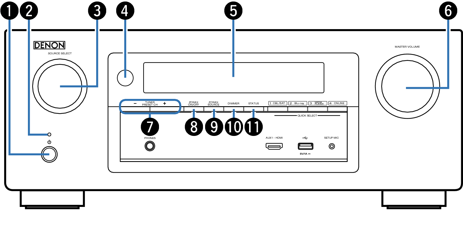 När hörlurar ansluts till det här uttaget matas inget ljud ut via de anslutna högtalarna eller från PRE OUT-anslutningarna.