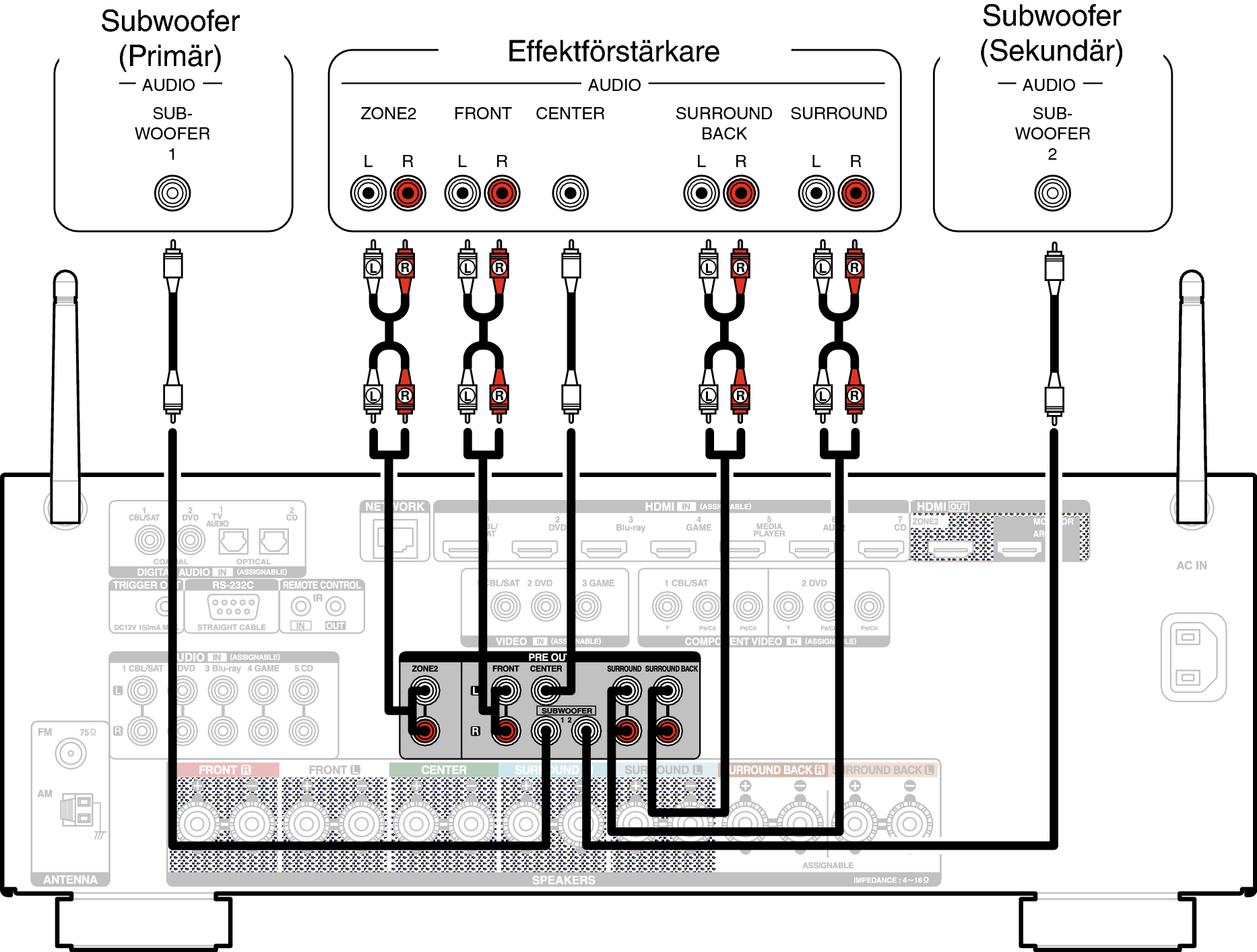 5.1-kanalig (anslutning till två förstärkare för fronthögtalare)