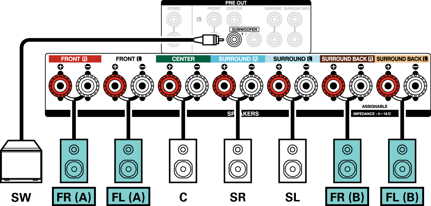 Den här anslutningsmetoden skapar ett 5.1-kanaligt högtalarsystem i MAIN ZONE och ett 2-kanaligt system i ZONE2.