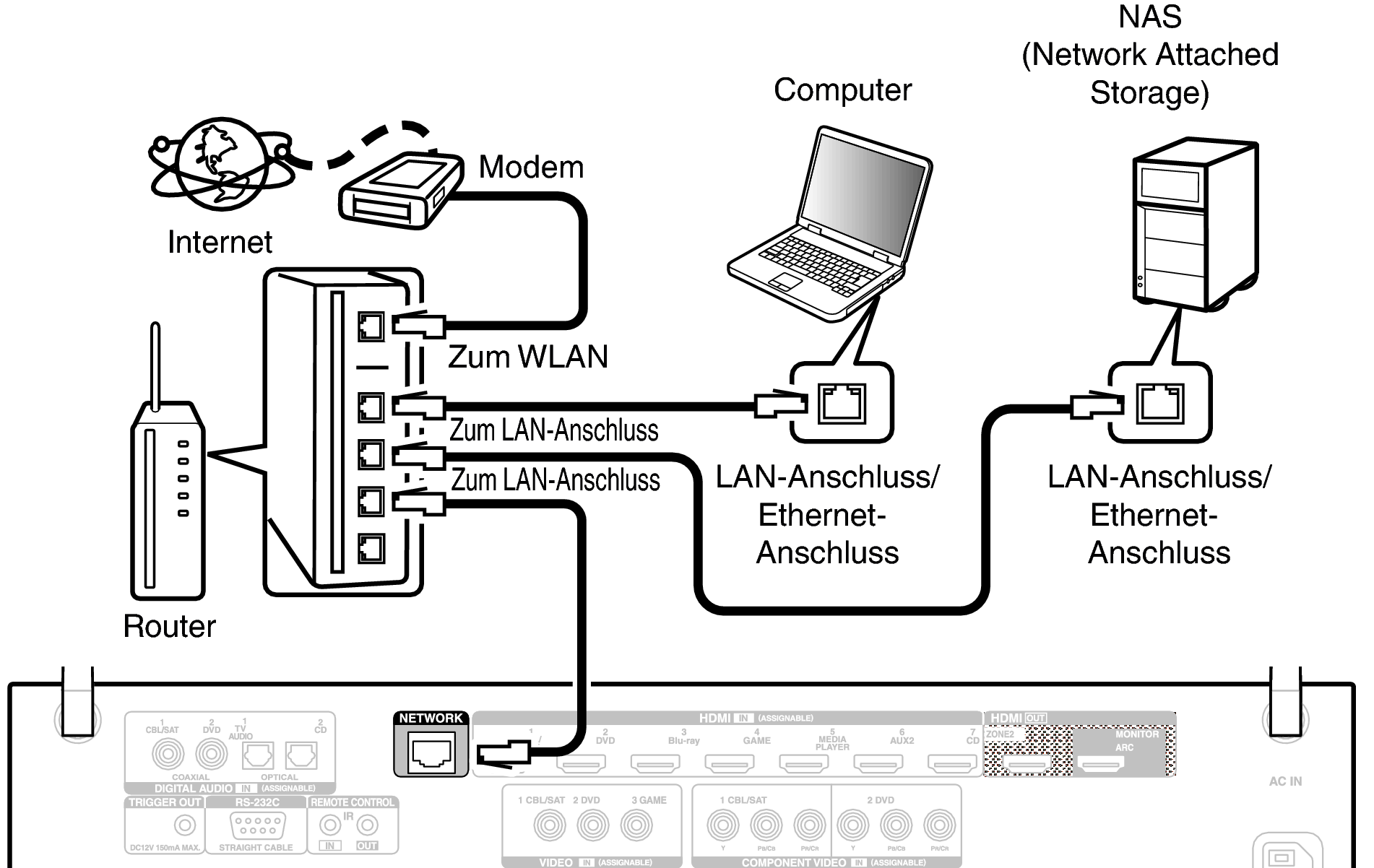 Für den Anschluss über ein kabelgebundenes LAN verbinden Sie den Router über ein LAN-Kabel mit diesem Gerät, wie in der nachstehenden Abbildung dargestellt.