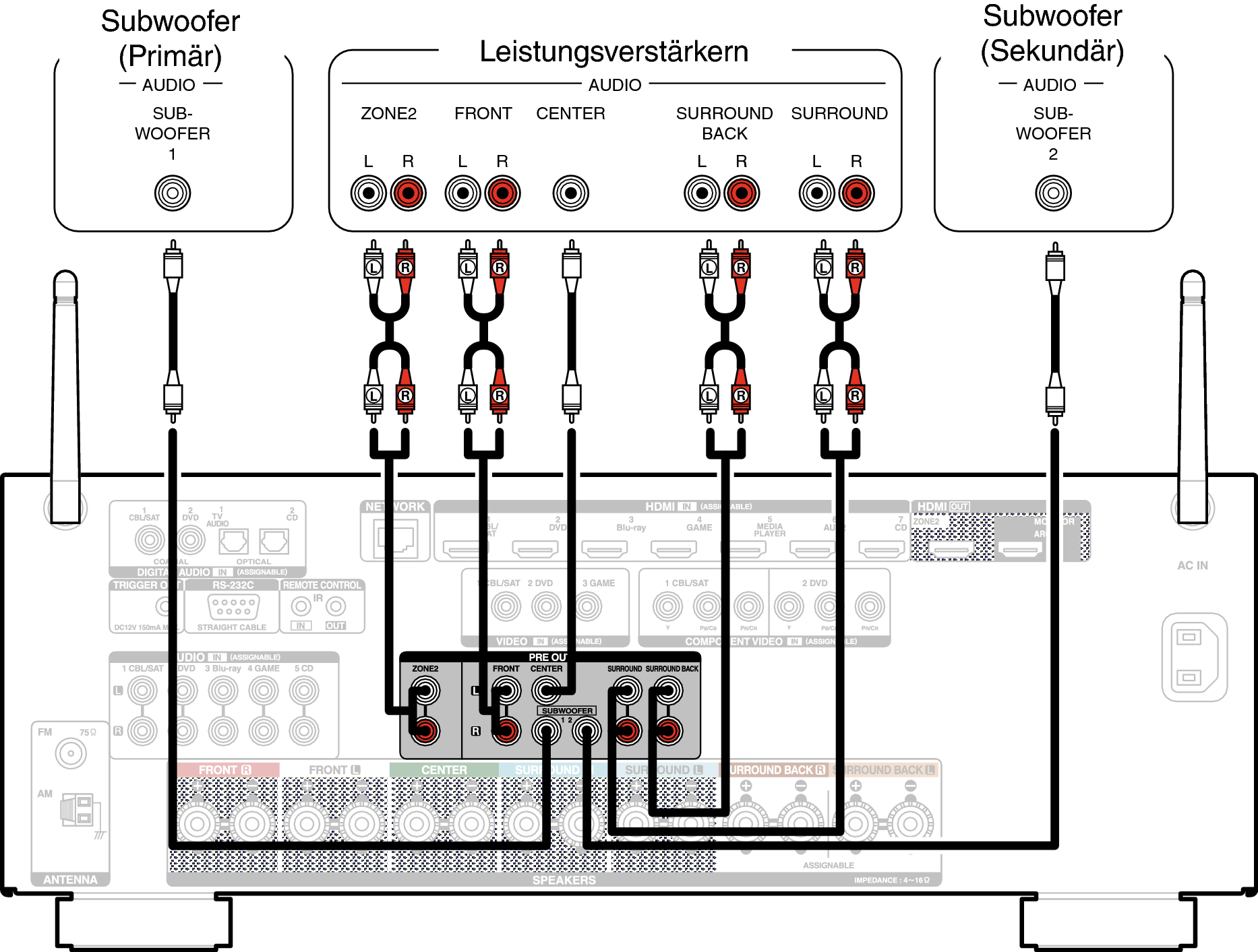 Sie können dieses Gerät als Vorverstärker verwenden, indem Sie einen externen Leistungsverstärker an die PRE OUT-Anschlüsse anschließen. Wenn Sie an jedem Kanal einen Leistungsverstärker hinzufügen, können Sie die Echtheit des Klangs noch weiter verbessern.