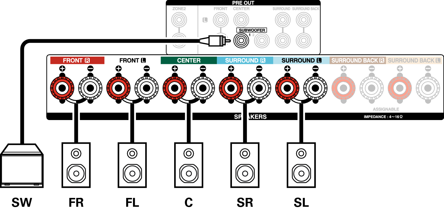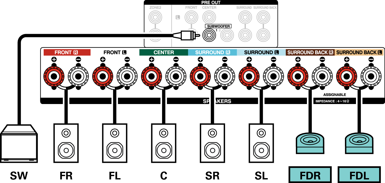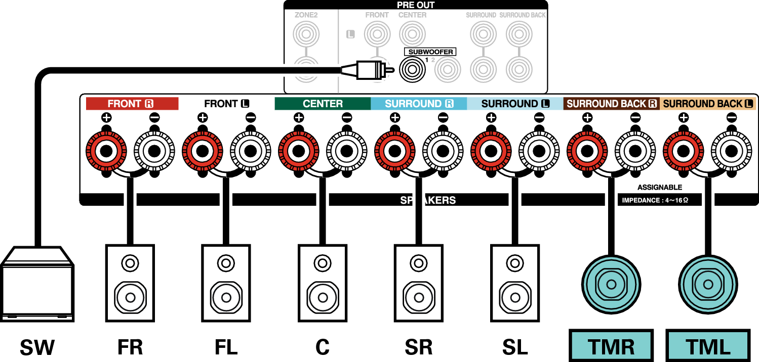 Wenn Sie nur einen Surround-Back-Lautsprecher verwenden, schließen Sie ihn am Anschluss SURROUND BACK L an.